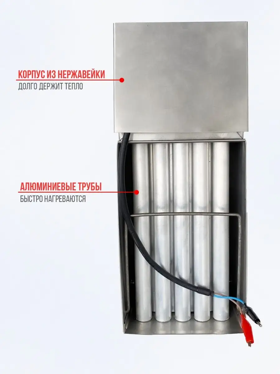 - Корпус Теплообменника изготовлен из нержавеющей стали толщиной 0.5мм, а нагреваемые трубки из алюминия имеющего отличную теплопроводность.