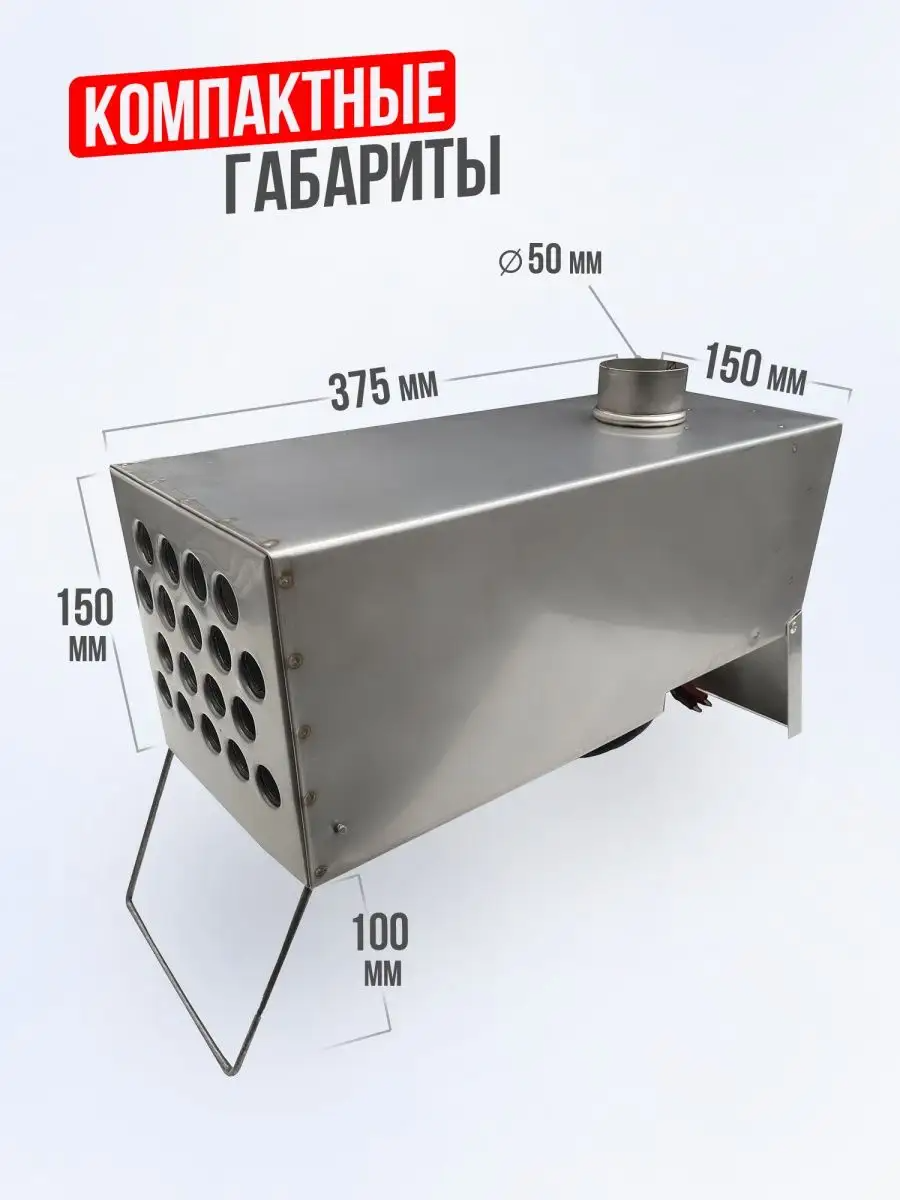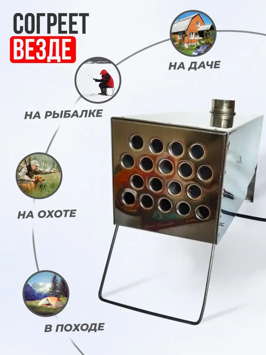 - Предназначен для обогрева рыболовных палаток и небольших помещений без вреда для здоровья, за счёт выхода отработанных газов через герметично соединённые трубы.
