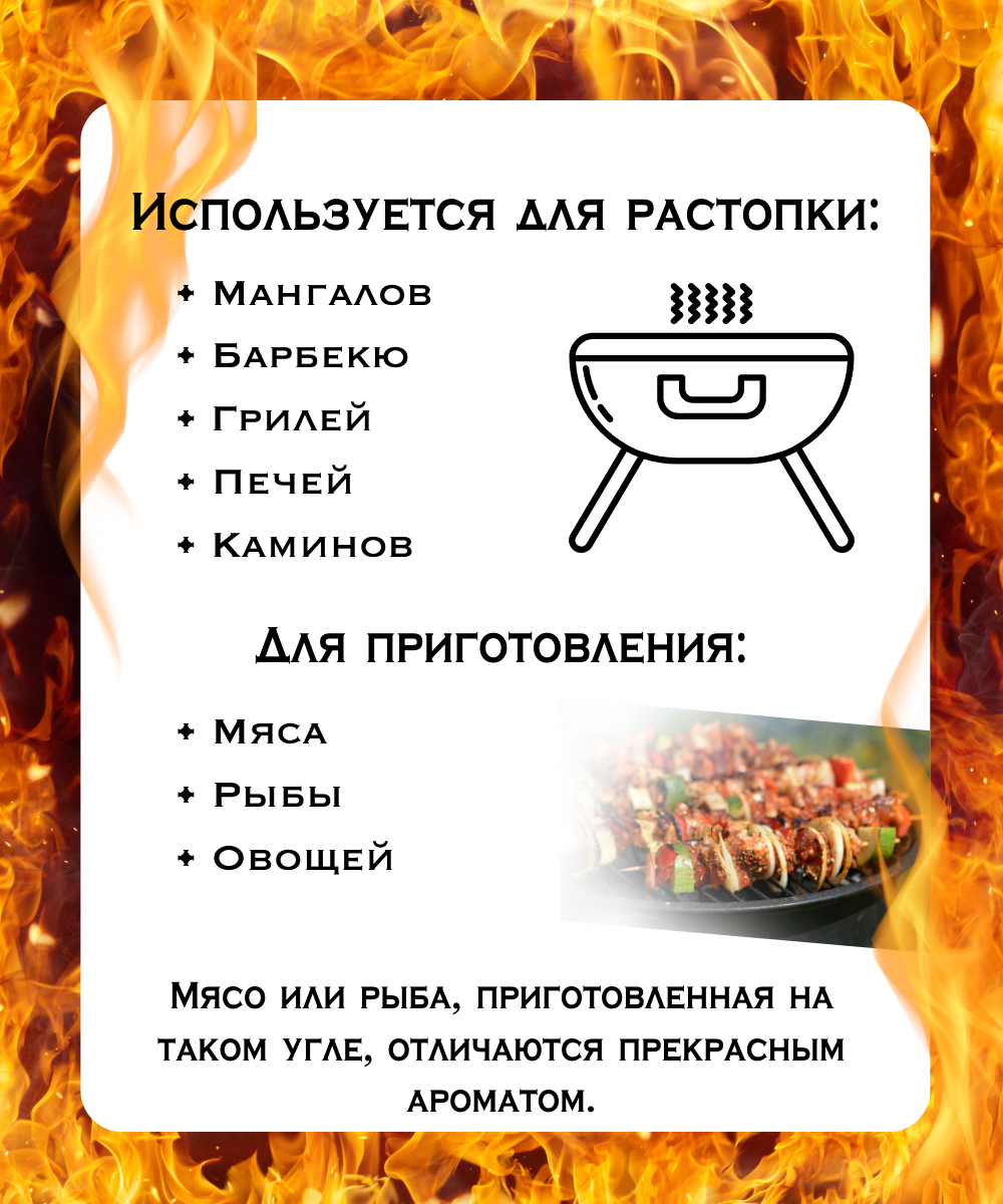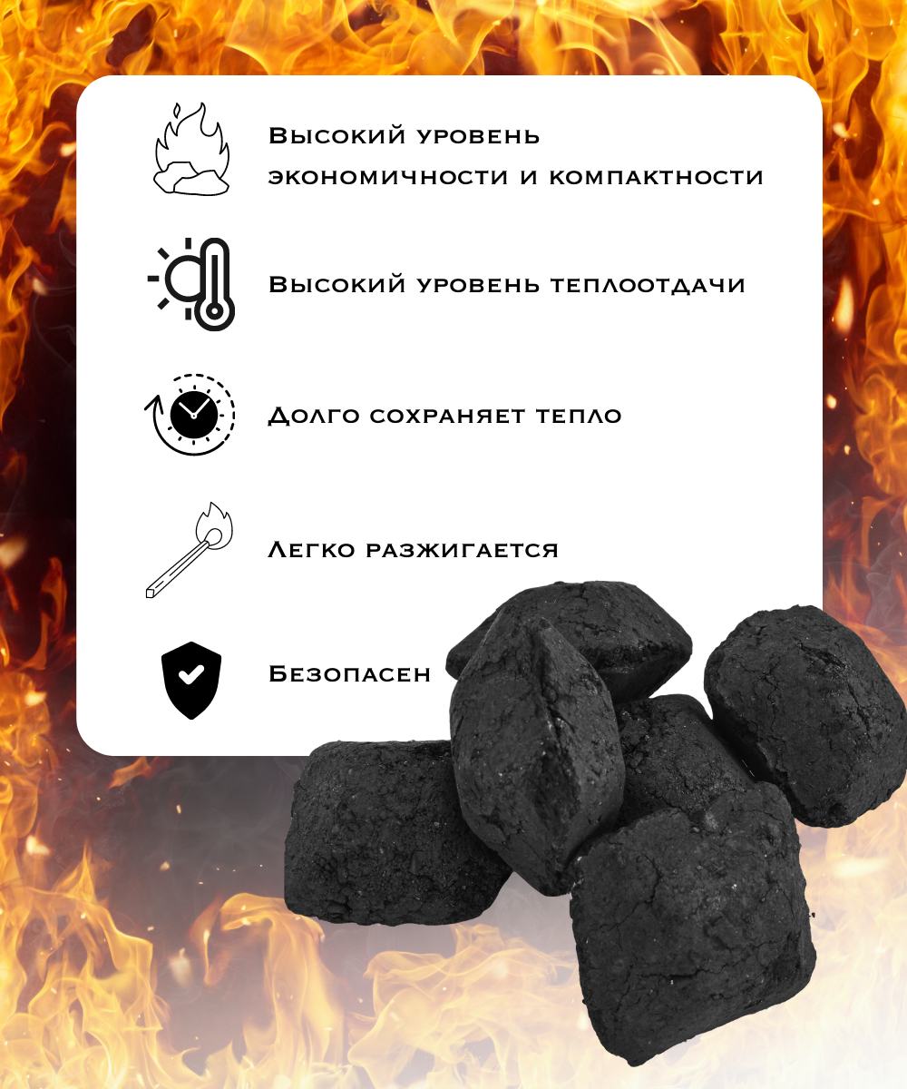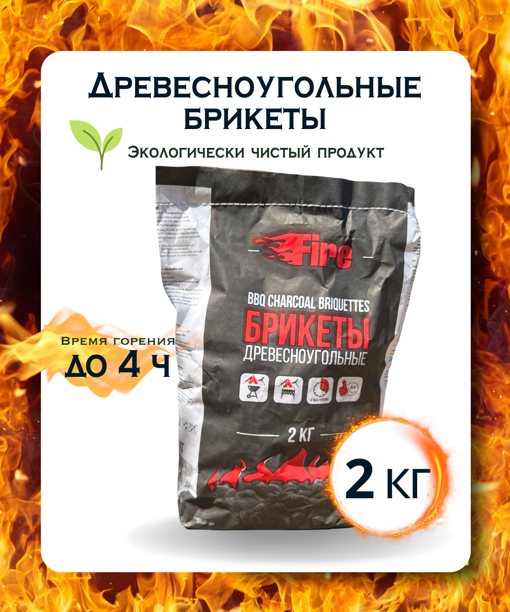 Натуральные древесноугольные брикеты Fire 2кг. Используется для приготовления разнообразных блюд на открытом огне. В отличии от дров, вы можете сразу приступать к приготовлению блюд, а не ждать, когда поленья прогорят. К основным преимуществам относят: высокий уровень теплоотдачи, длительный период горения (обеспечивает правильную прожарку блюд), быстрый розжиг, высокий уровень экономичности и компактности.