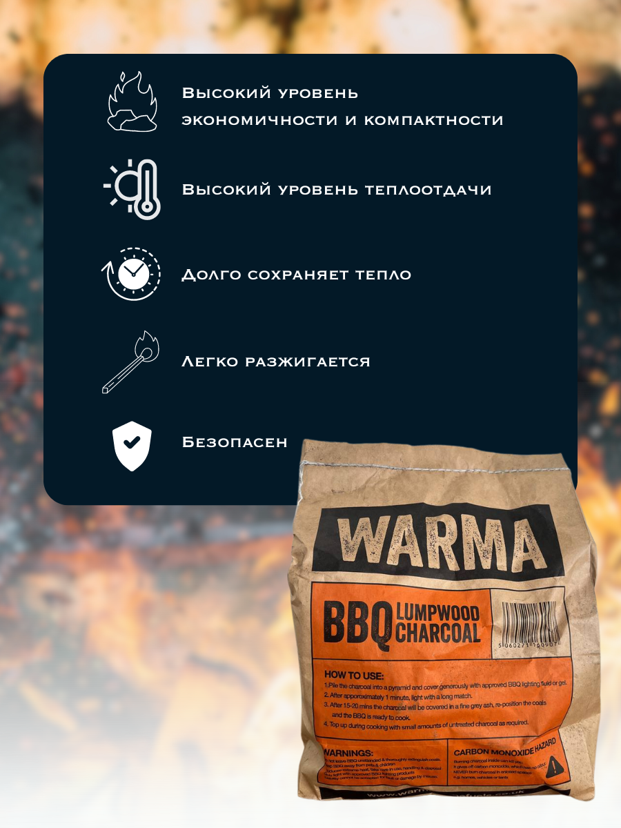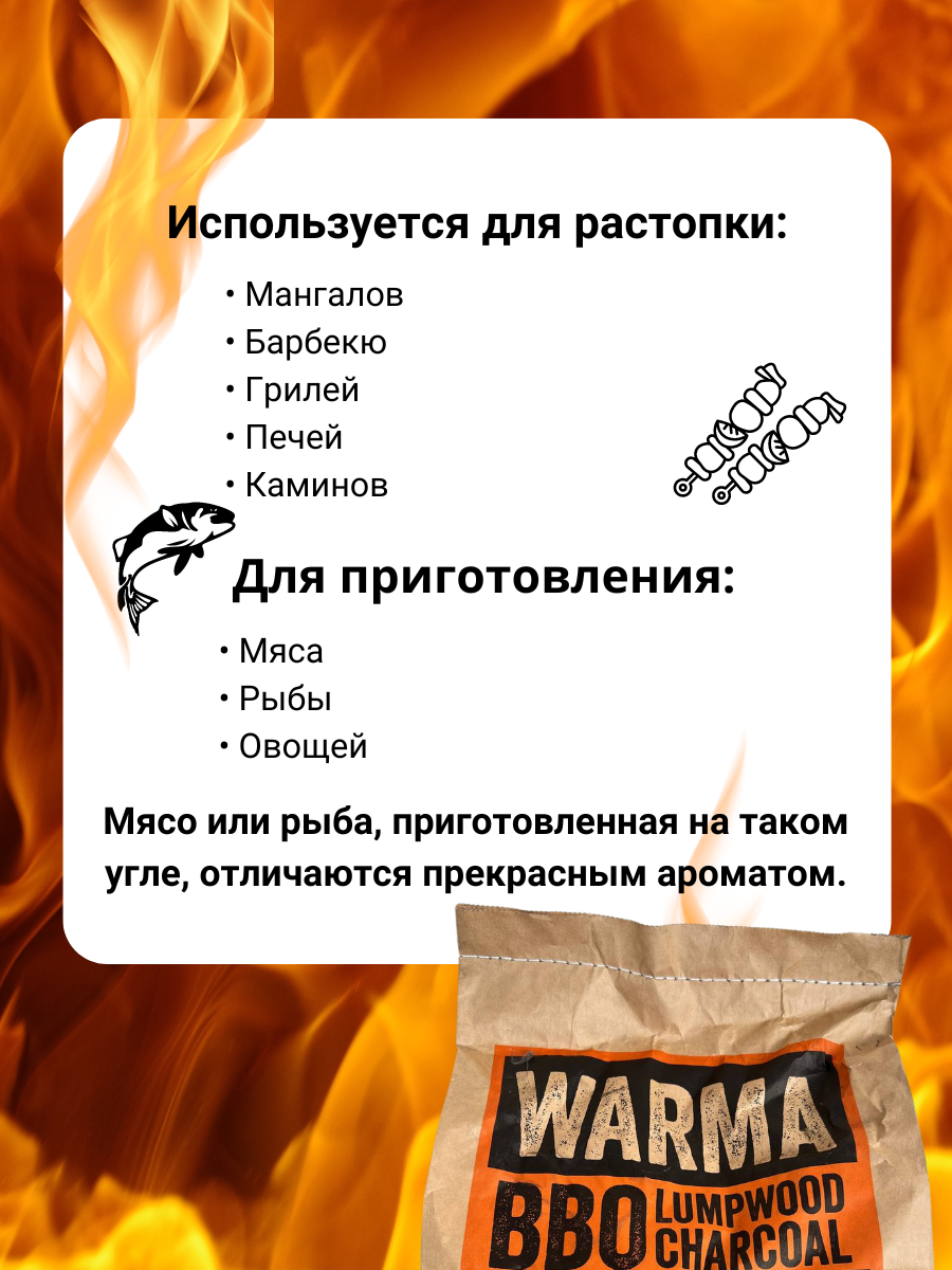 Натуральный древесный уголь используется для приготовления разнообразных блюд на открытом огне. В отличии от дров, вы можете сразу приступать к приготовлению блюд, а не ждать, когда поленья прогорят.