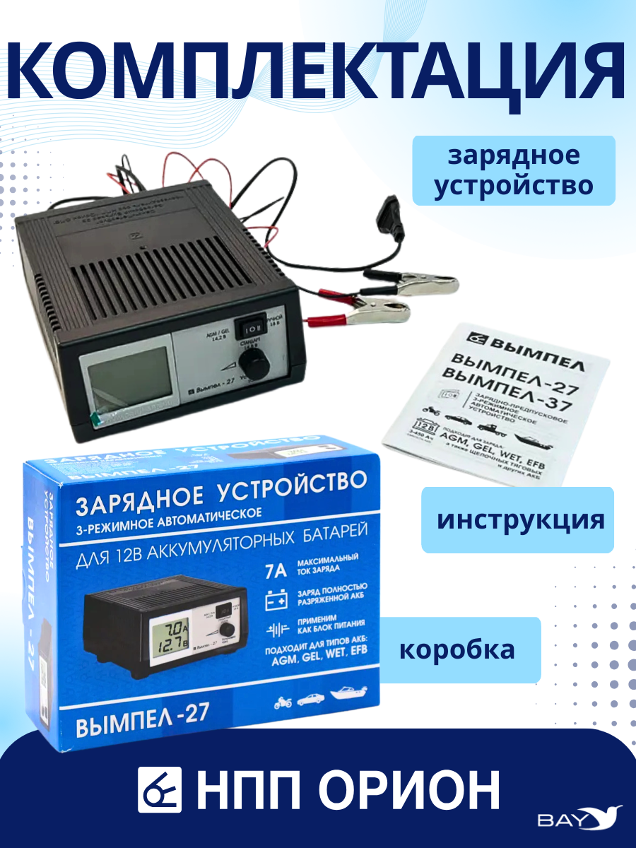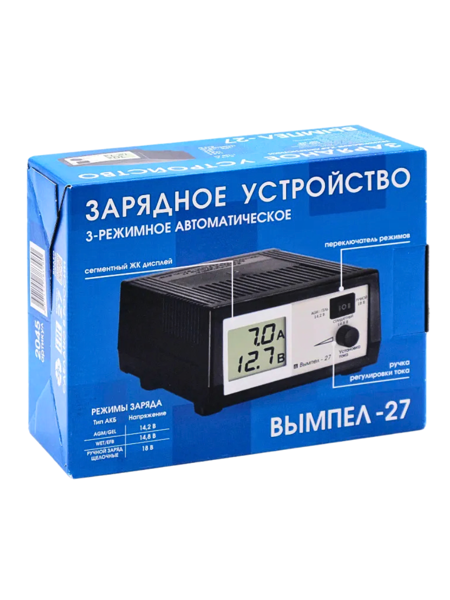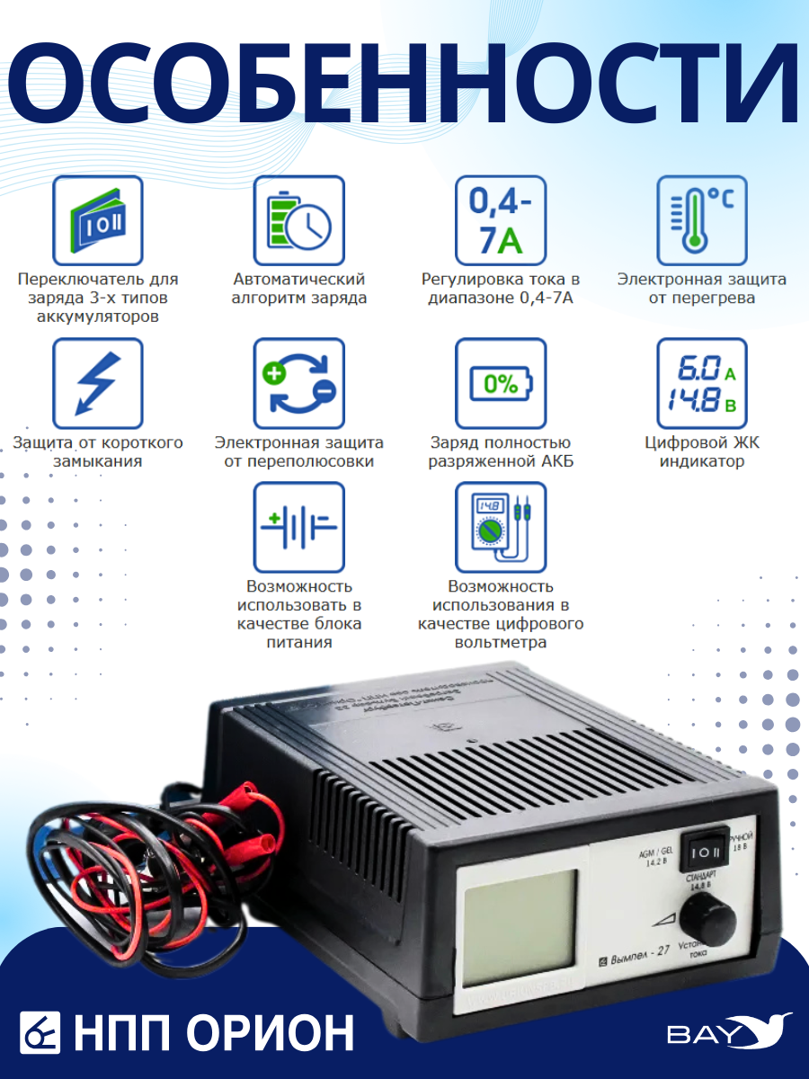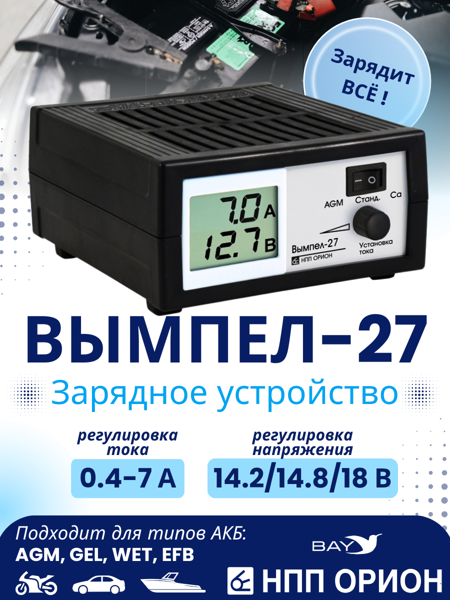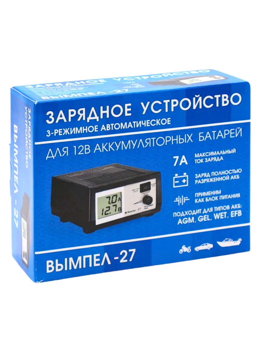 Зарядное устройство Вымпел 27 разработано специально для обслуживания различных типов аккумуляторов, используемых в водной технике. Поддерживает все распространенные технологии АКБ, включая полностью разряженные батареи.