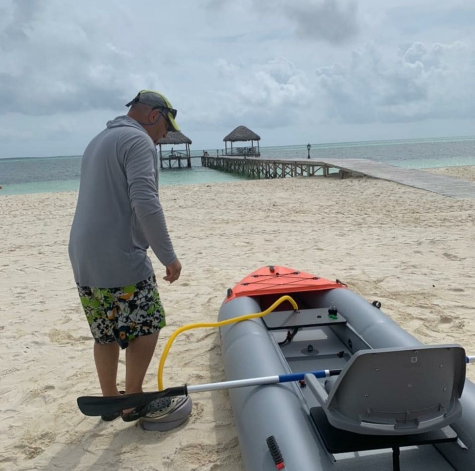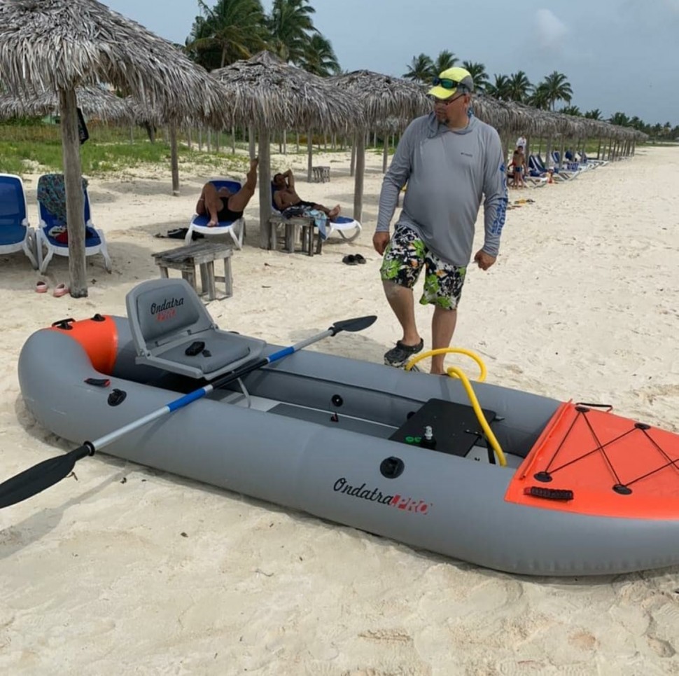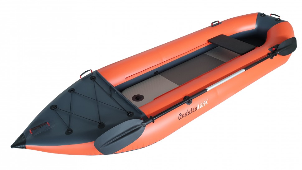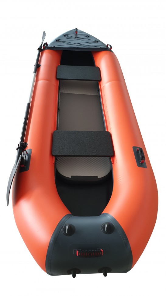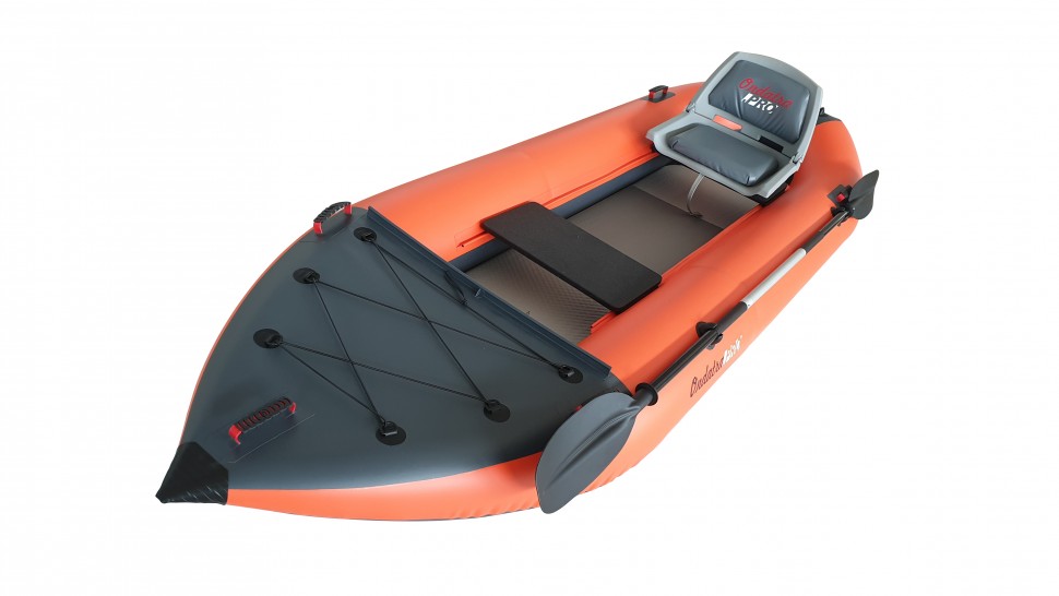 Рыболовный каяк. Идеальный каяк для рыбака с возможностью установки дополнительных опций, расширяющих возможности каяка. Пластиковое поворотное сиденье, жесткий надувной пол из Аэрдека, что позволяет стоять. ПВХ 850гр/м.кв. Вес каяка в полной комплектации, как на фото 21 кг. При использовании мотора необходимо применять гидрокрыло. Дно высокого давления 210 см по ровному полу. Максимальная мощность мотора до 3,5 л/с при использовании гидрокрыла. Имеются дополнительные поперечные перегородки внутри баллонов.