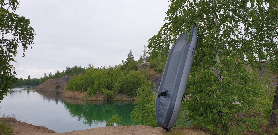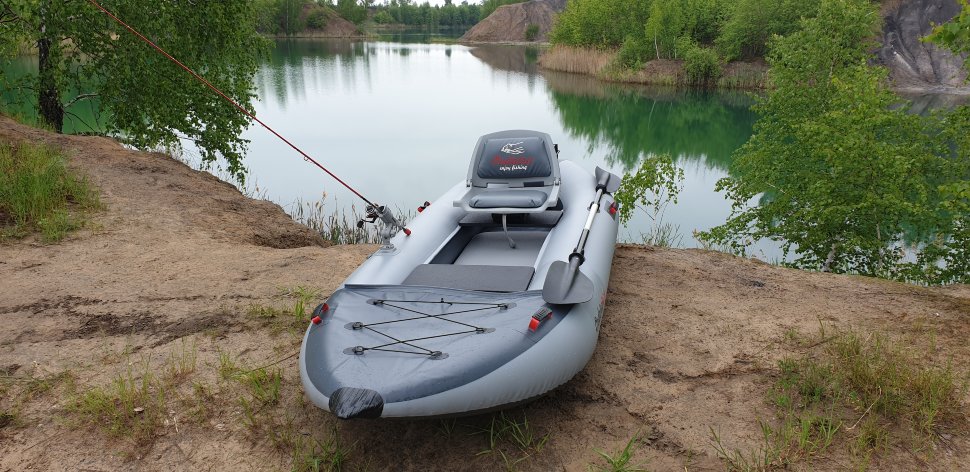 Рыболовный каяк. Идеальный каяк для рыбака с возможностью установки дополнительных опций, расширяющих возможности каяка. Пластиковое поворотное сиденье, жесткий надувной пол из Аэрдека, что позволяет стоять. ПВХ 850гр/м.кв. Вес каяка в полной комплектации, как на фото 21 кг. При использовании мотора необходимо применять гидрокрыло. Дно высокого давления 210 см по ровному полу. Максимальная мощность мотора до 3,5 л/с при использовании гидрокрыла. Имеются дополнительные поперечные перегородки внутри баллонов.