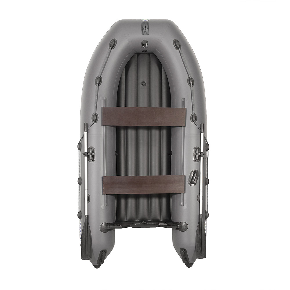 Дополнительный комфорт в использовании вам создадут наружная и внутренняя накладка под мотор на жестоком транце, 3 ручки с намоткой для переноски, ручка шкипера, кольцо для фиксации канистры бензина, привальный брус с отбойником, усиление дна ПВХ профилем шириной 60 мм по баллонам и килю. На носу лодки установлен якорный рым собственного производства, выполненный из специального более прочного, чем стандартный ABC-пластик. "Рым-утка» - предназначен для быстрого, простого и надёжного крепления якорной веревки в любом положении, и когда якорь на дне, и когда он приподнят. Рекомендуется использовать веревку диаметром от 5 мм. Один из воздушных клапанов расположен на носу лодки, что значительно экономит время сборки-разборки. НДНД придает дополнительную устойчивость на воде, а само дно является теплоизолятором, что удобно при длительном нахождении на воде.