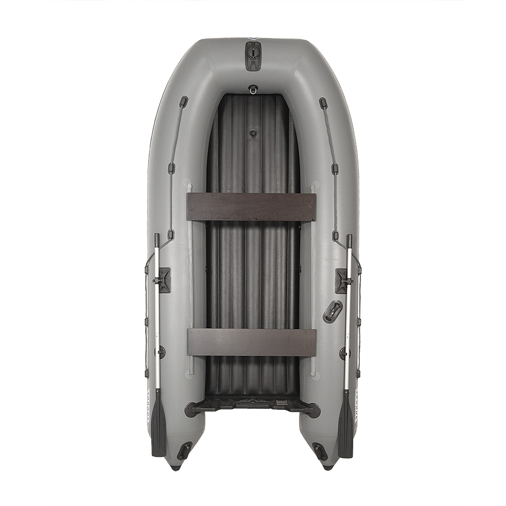 Дополнительный комфорт в использовании вам создадут наружная и внутренняя накладка под мотор на жестоком транце, 3 ручки с намоткой для переноски, ручка шкипера, кольцо для фиксации канистры бензина, привальный брус с отбойником, усиление дна ПВХ профилем шириной 60 мм по баллонам и килю.