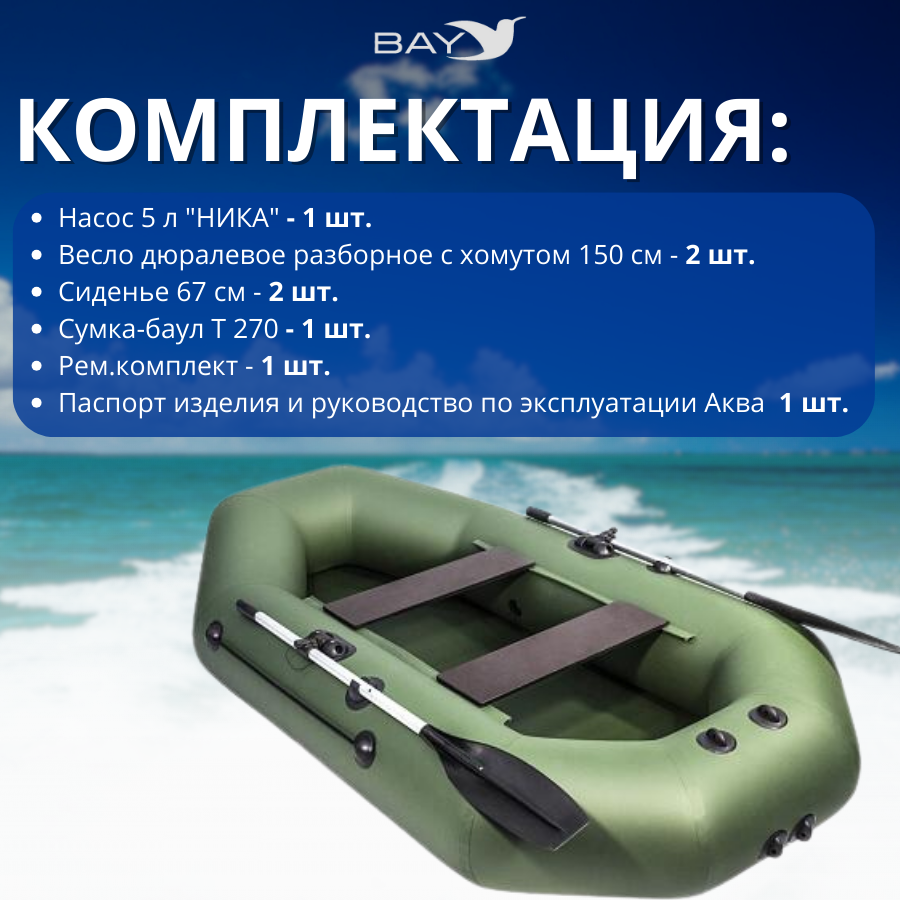Надувная ПВХ лодка «Аква Мастер 240» - легкое двухместное судно, предназначено для прибрежной рыбалки в закрытых водоемах и может эксплуатироваться в качестве судна для преодоления небольших водных преград при пеших походах, сбора стреляной дичи на утиной охоте. Бортовой баллон, диаметром 36 см имеет два независимых отсека, каждый из которых оснащен воздушным клапаном. Дно лодки приклеено к нижней касательной части борта, перекрывая его, тем самым, защищая от преждевременного истирания ткани баллона. При производстве этой модели используется ПВХ материал плотностью 750 г/кв.м зеленого или серого цвета. Габариты кокпита составляют 168 см по длине и 58 см по ширине.