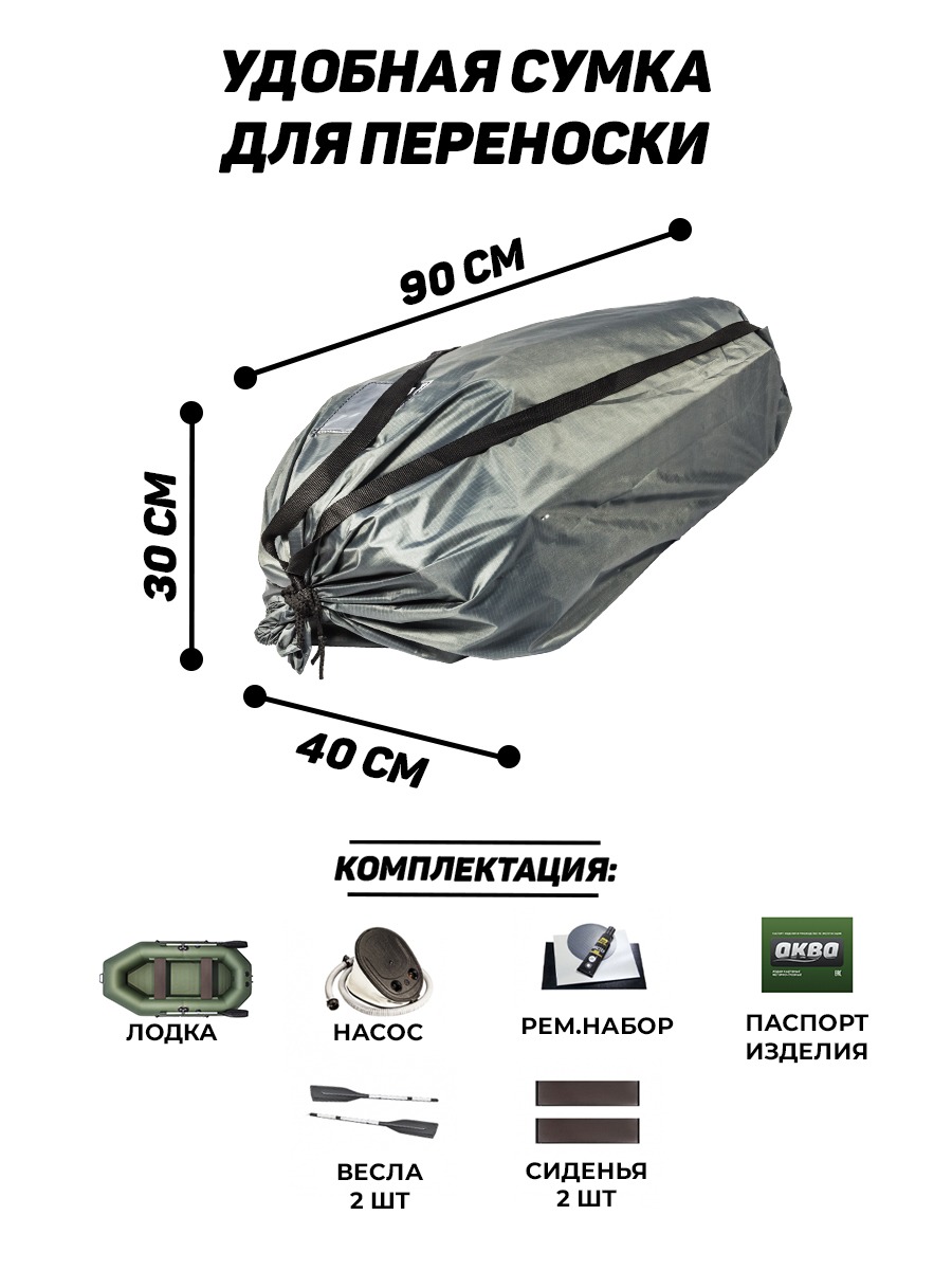 Упаковываются лодки ПВХ «Аква-Мастер» в удобную сумку-рюкзак. Это позволяет, как перевозить их на автомобиле, так и без труда нести на себе в труднодоступные места. Кроме упаковочной сумки в комплект поставки лодки ПВХ «Аква-Мастер» входят сидения, насос, весла, ремкомплект.