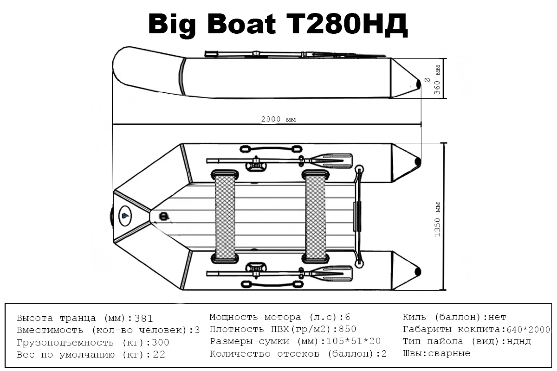 Лодка Big Boat Т280НД – это транцевая модель с размерами 2800х1360 мм и диаметром бортовых баллонов 360 мм. Её грузоподъемность достигает 300 кг. Конструкция включает два независимых надувных отсека, что обеспечивает сохранение плавучести лодки даже при повреждении одного из них.