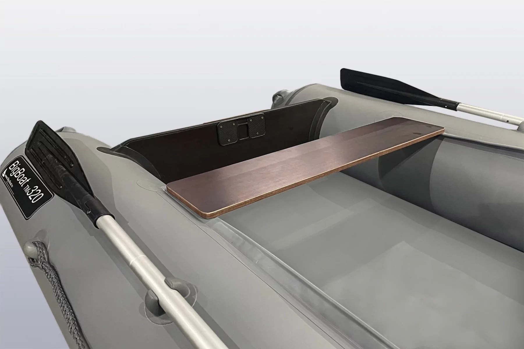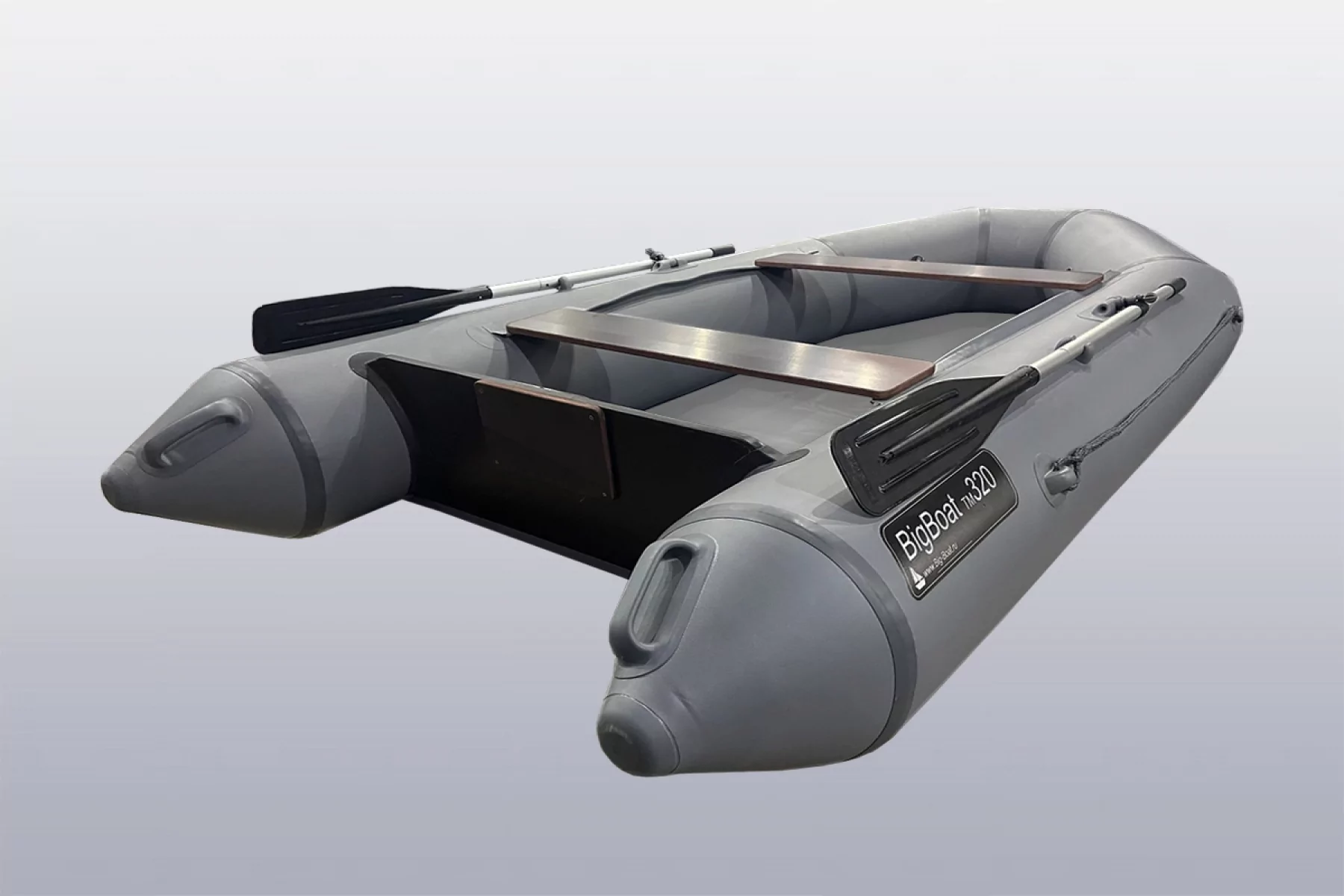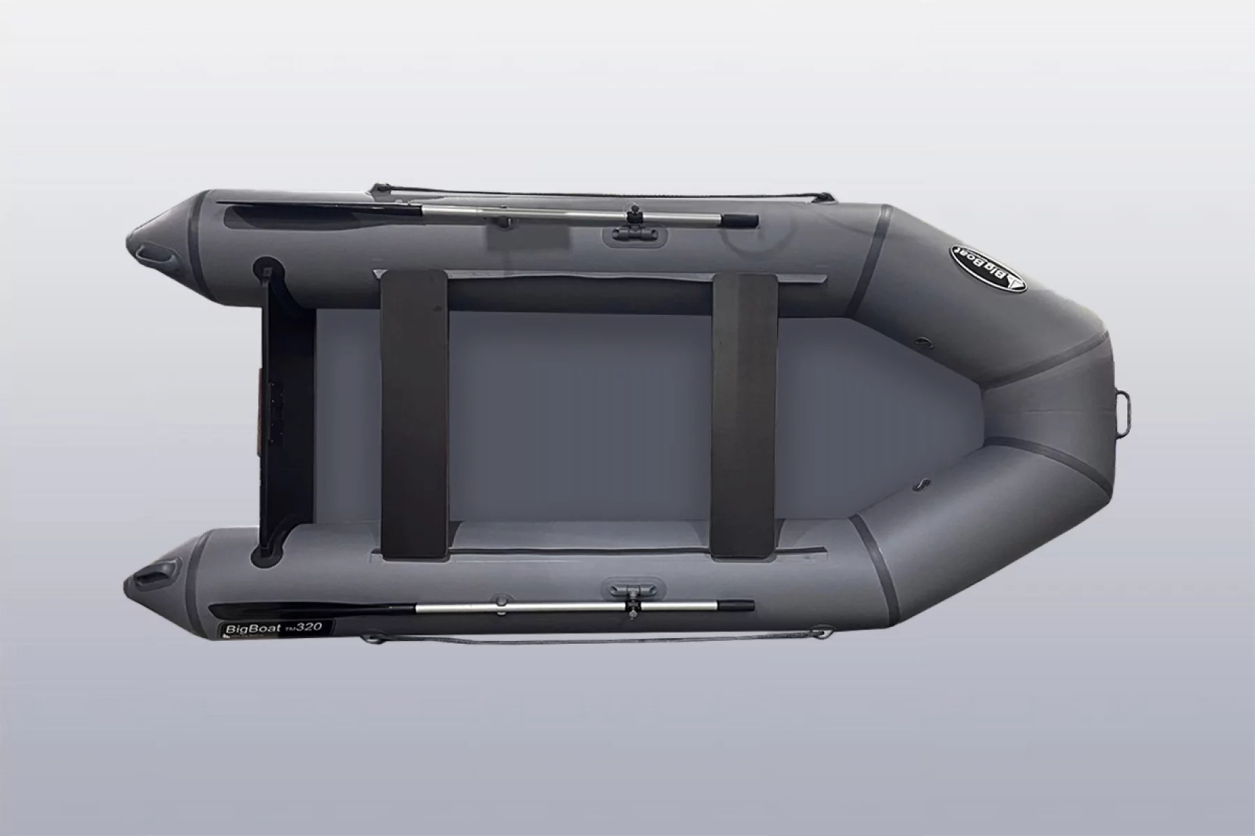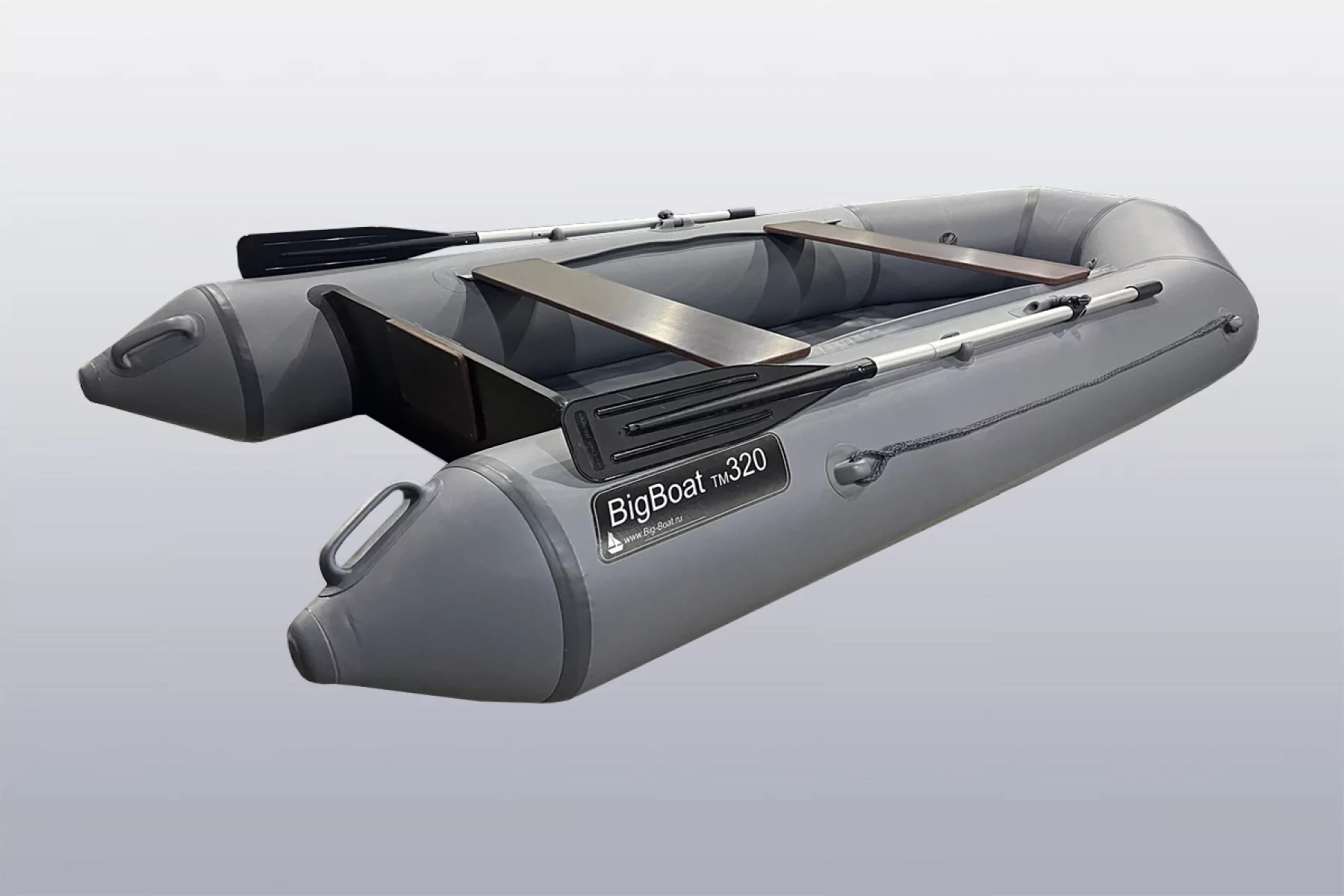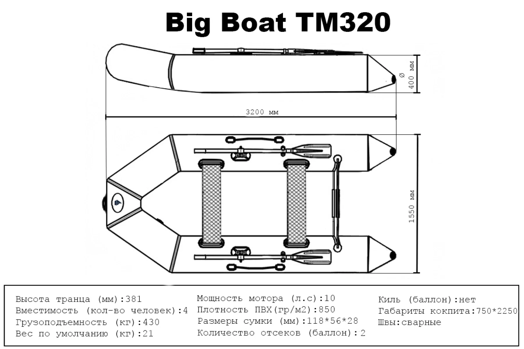 Лодка Big Boat ТМ320 представляет собой транцевую плоскодонную модель с размерами 3200х1550 мм и диаметром баллонов 400 мм. Она рассчитана на грузоподъемность до 430 кг. Лодка оснащена тремя независимыми надувными отсеками, которые обеспечивают её плавучесть даже при проколе двух из них.