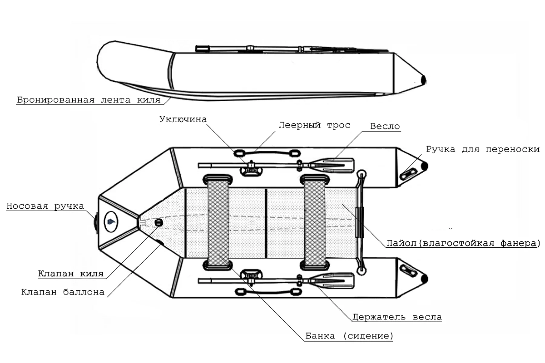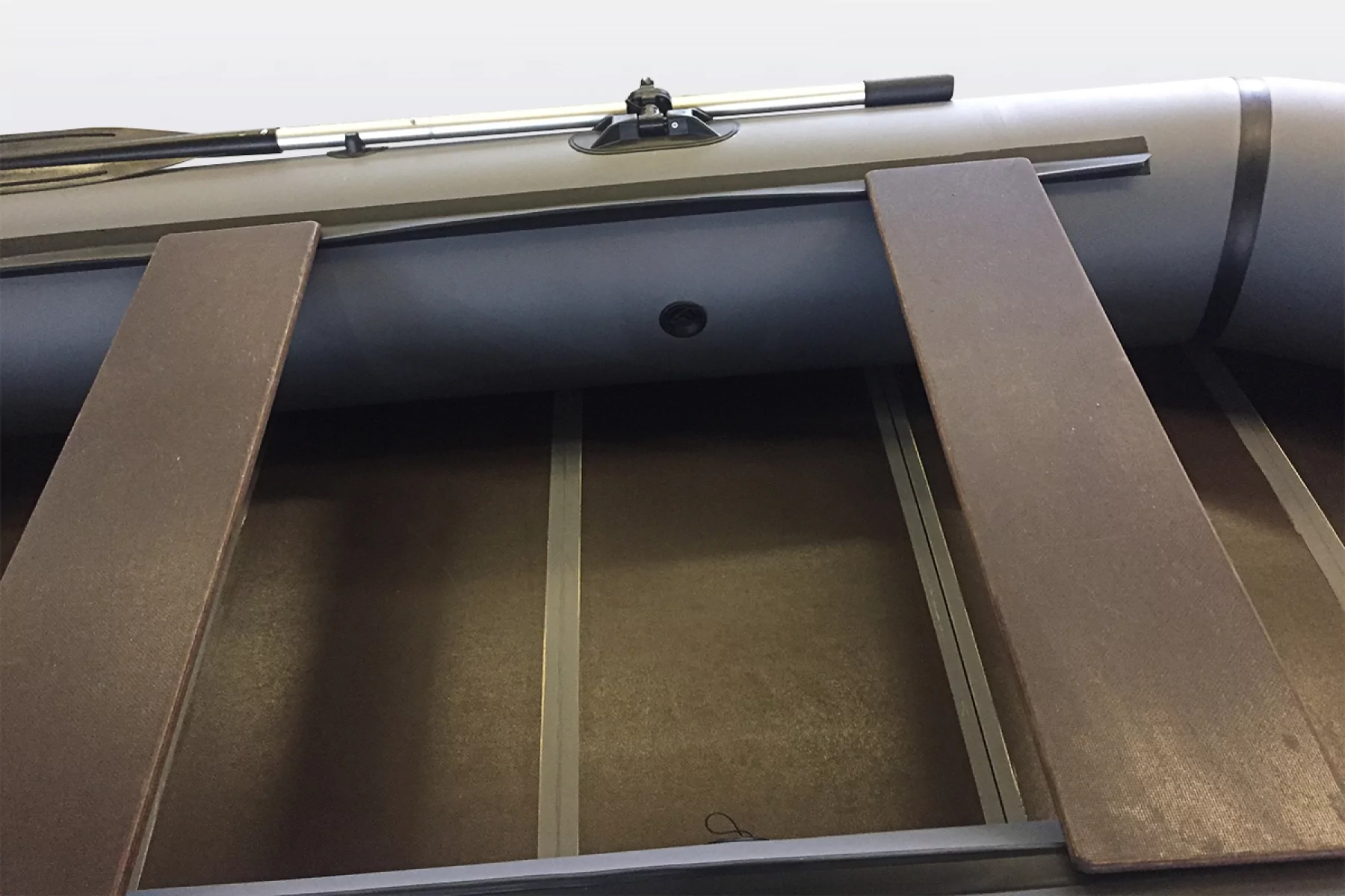 Каждая лодка оснащена удобными лавками, которые можно перемещать вдоль борта. В стандартную комплектацию входят пол-книжка и весла длиной 1,6 м, которые можно заменить на разборные весла длиной 2 м за дополнительную плату.