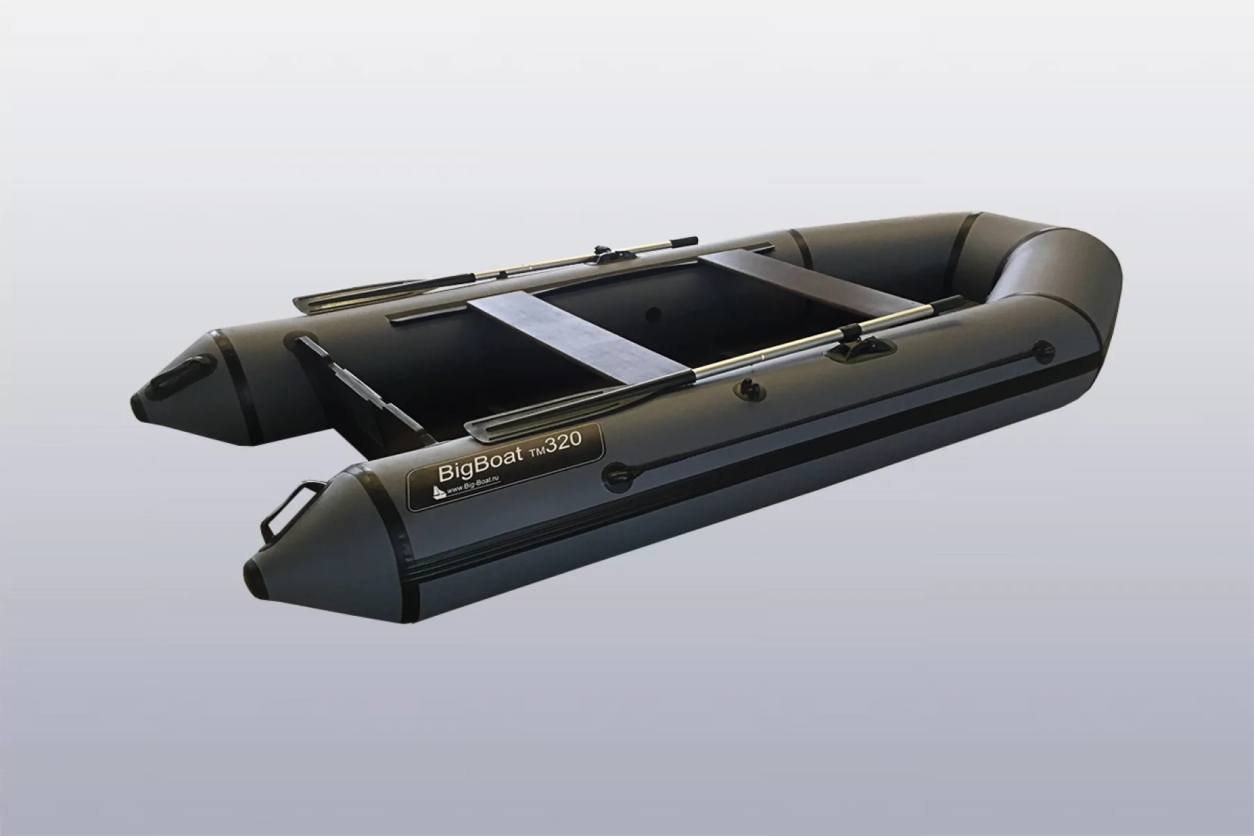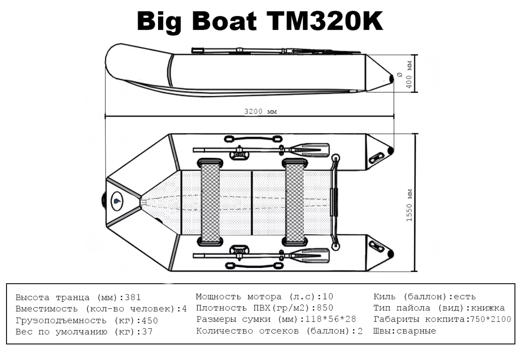 Лодка Big Boat ТМ320К представляет собой транцевую килевую лодку с размерами 3200х1550 мм и диаметром бортовых баллонов 400 мм. Её грузоподъемность достигает 450 кг. Конструкция включает два независимых надувных отсека, что обеспечивает сохранение плавучести даже при повреждении одного из них.