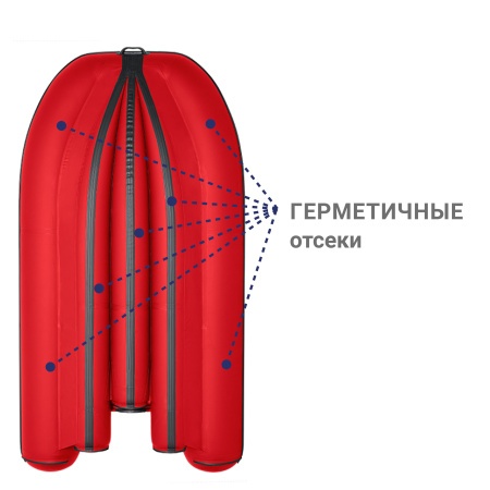 Высокая надежность модели обеспечивается 5-ю независимыми баллонами. Днище состоит из 3-х баллонов, борт — из подковообразного баллона, разделенного на 2 независимых отсека. В надувных лодках ПВХ FM Light отсутствует пайол из фанеры, что снижает вес собранной лодки. Жесткости многобаллонного надувного днища высокого давления достаточно, чтобы комфортно чувствовать себя, ловить или стрелять с лодки стоя без пайола.