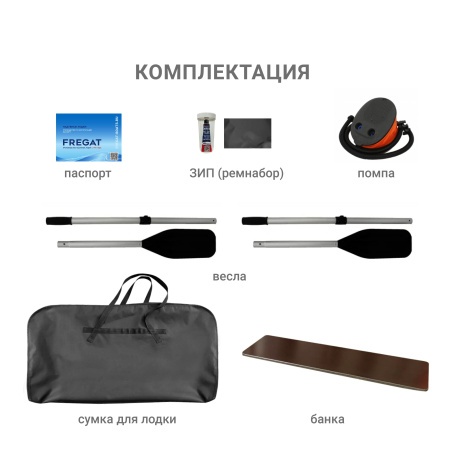 Лодка, весла, сиденье (банка), сумка, паспорт, ножная помпа (насос), ремкомплект.
