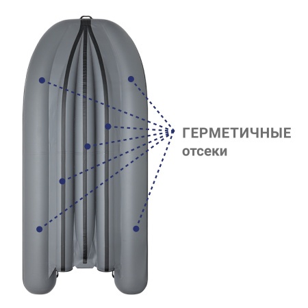 Основные баллоны лодки разделены герметичными перегородками, что обеспечивает непотопляемость лодки и возможность добраться до берега в случае повреждения других отсеков.