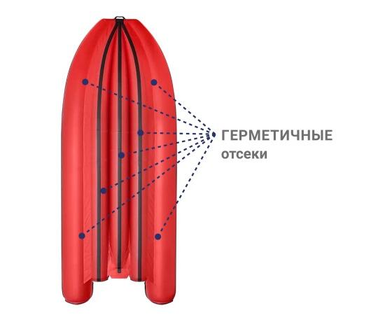 Дно надувной лодки Фрегат образуют 3 продольных баллона, приклеенных к самоотливной палубе, находящейся при полной загрузке лодки выше уровня воды.