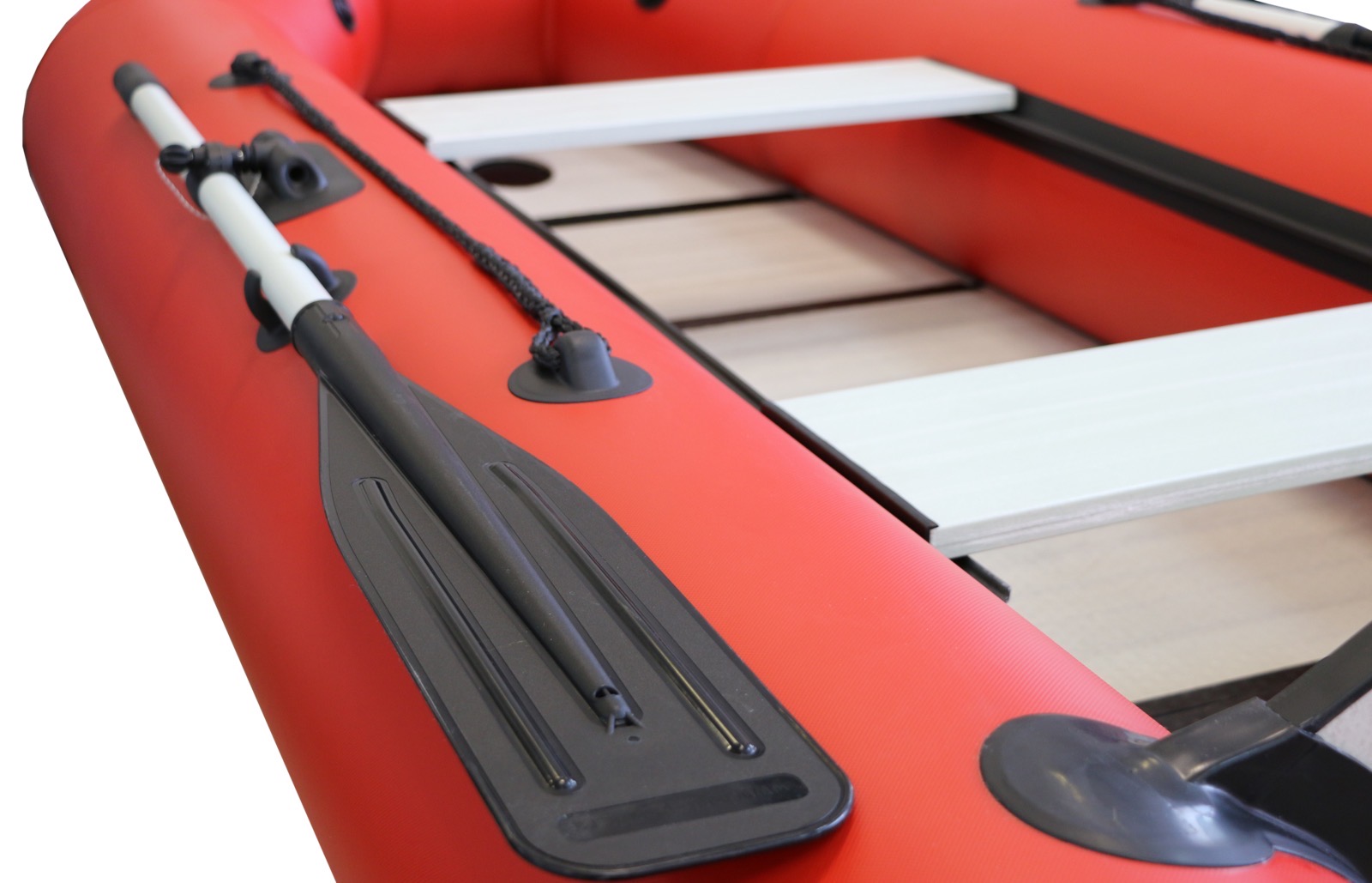 - стеклокомпозитные слани в комплекте; - стеклокомпозитный транец, стеклокомпозит прочный, влагостойкий материал, не подверженный гниению. - суперпрочные стеклокомпозитные весла. - стеклокомпозитные банки (лодочные сидения) - надежные швы, полностью сварные баллоны; - удобное крепление банки лик-трос, лик-паз - надежный ПВХ 750 гр/м2; - надувной кильсон