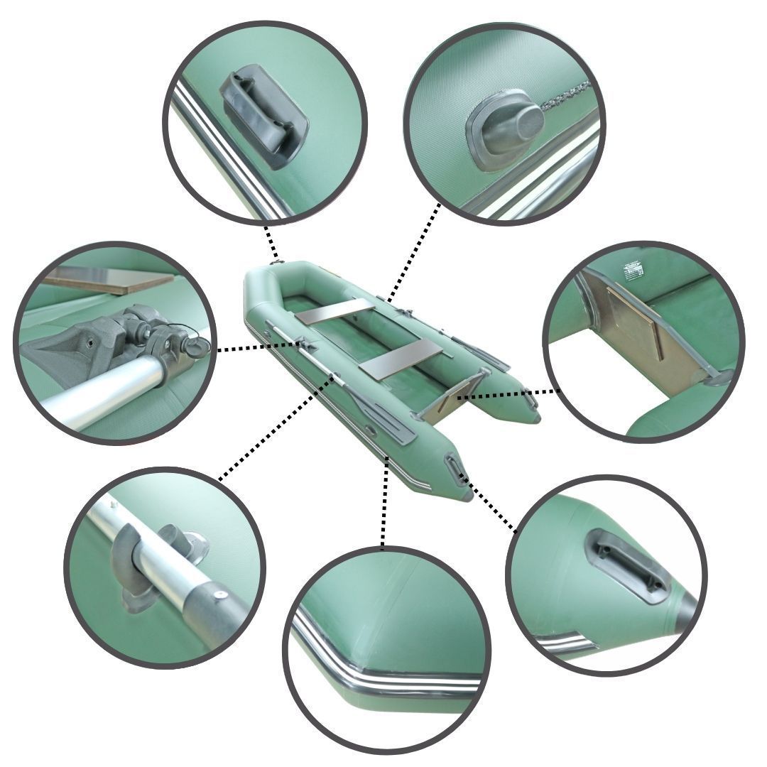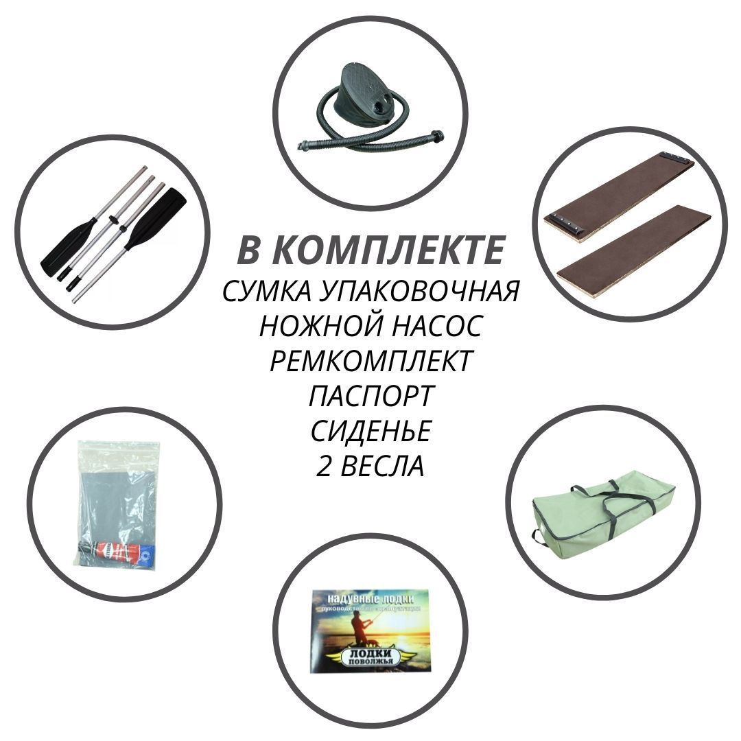 Надувная лодка изготовлена из армированного ПВХ материала, плотностью 900 г/м2. Лодка образована тремя надувными отсеками, для безопасности герметично изолированными друг от друга. Отсеки надежно проклеены друг с другом и соединены с натяжным дном. Благодаря такой конструкции лодку удобно сложить в специальную сумку для переноски, которая идет в комплекте. Для накачивания лодки в комплекте поставляется ножной насос (помпа).