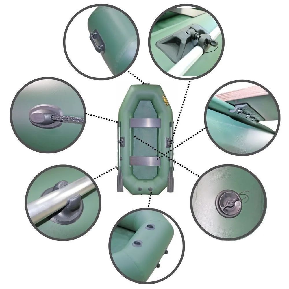 Надувная лодка изготовлена из армированного ПВХ, плотностью 850 грамм на квадратный метр. Лодку образуют два надувных баллона и натяжное дно. Для накачивания и подготовки лодки в комплекте поставляется ножная помпа.