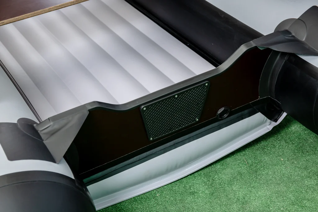 - Жёсткий встроенный транец из водонепроницаемой фанеры толщиной 24 мм. с двумя накладками — позволяет использовать подвесной мотор до 30 л.с. Транец оборудован сливным клапаном. Косынки из ПВХ между транцем и баллонами защищают кокпит от попадания брызг от мотора.