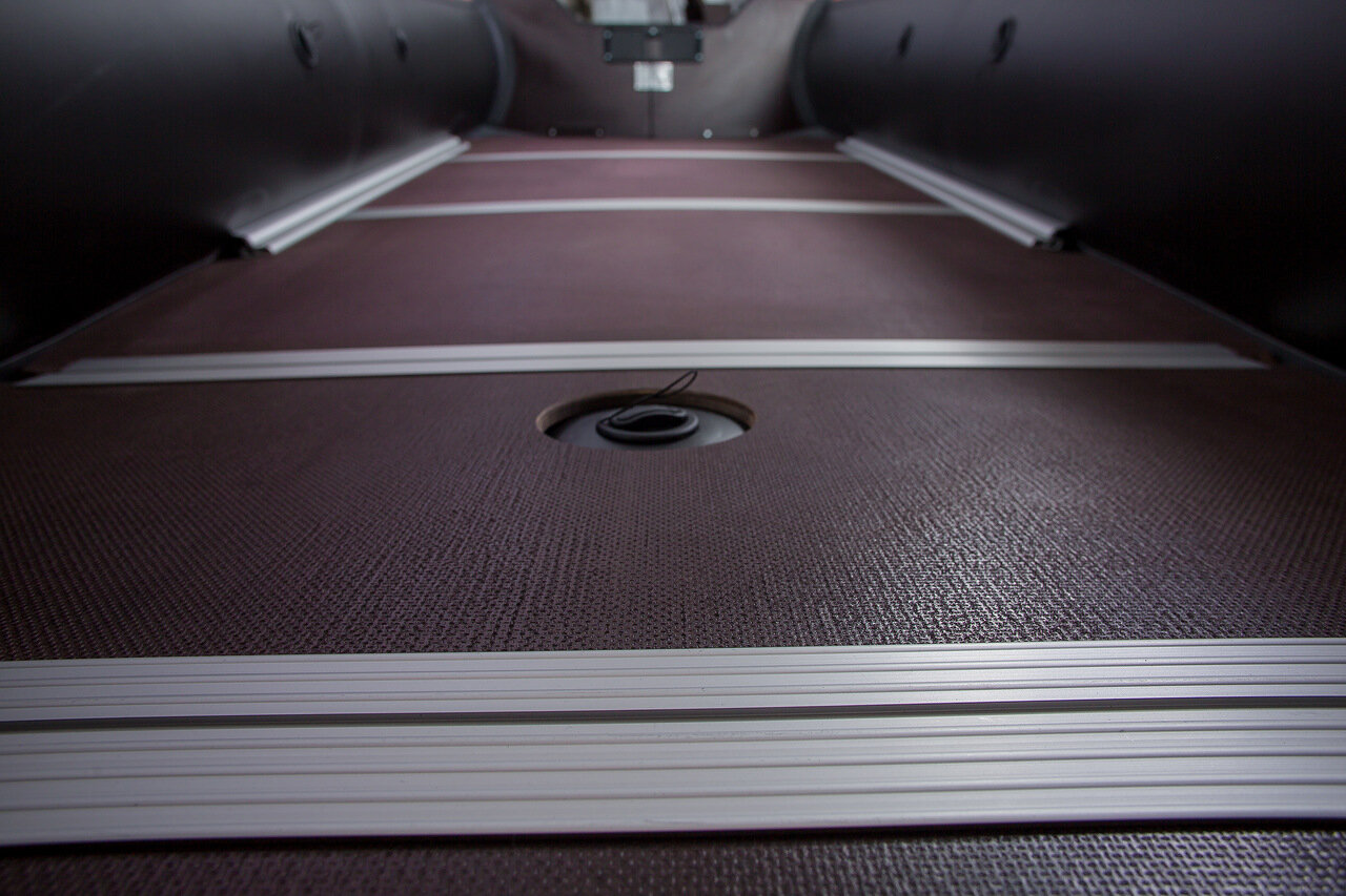 Моторно-килевые лодки RiverBoats RB-410 комплектуются пайолом, изготовленным из влагостойкой фанеры толщиной 12 мм с антискользящим покрытием и продольными алюминиевыми стрингерами, обеспечивающими жесткость пола.