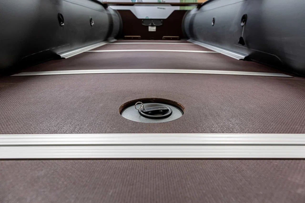 Моторно-килевые лодки RiverBoats RB-490 комплектуются пайолом, изготовленным из влагостойкой фанеры толщиной 12 мм с антискользящим покрытием и продольными алюминиевыми стрингерами, обеспечивающими жесткость пола.