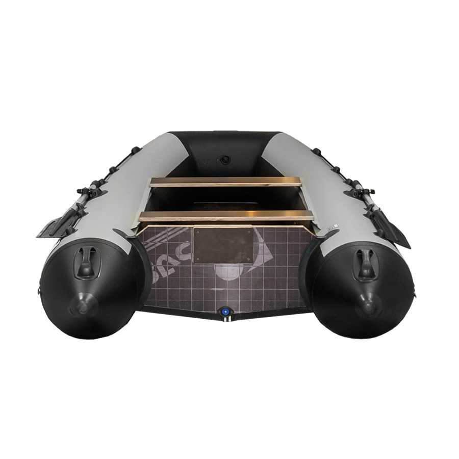 Лодка RUSBOAT 340LS оснащена стационарным транцем, который позволяет установить навесной мотор до 15 лошадиных сил. Лодка вокруг обклеена привальным брусом как дополнительное средство защиты, к которому можно цеплять ходовые и транспортировочные тенты, а надувной киль проклеен защитной полосой.