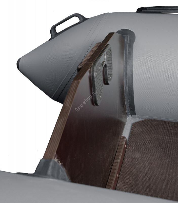 Надувная лодка оснащена стационарным транцем толщиной 18 мм, на который можно установить мотор мощностью до 10 л.с.. Транец вклеен в корпус лодки с использовнием транцхолдера.