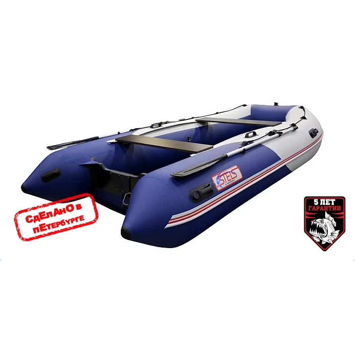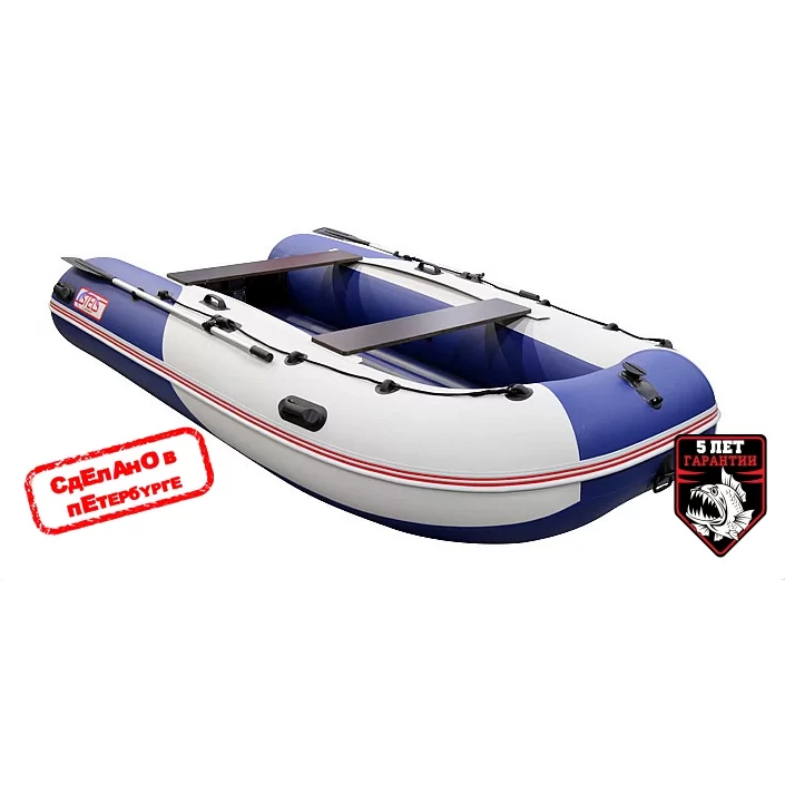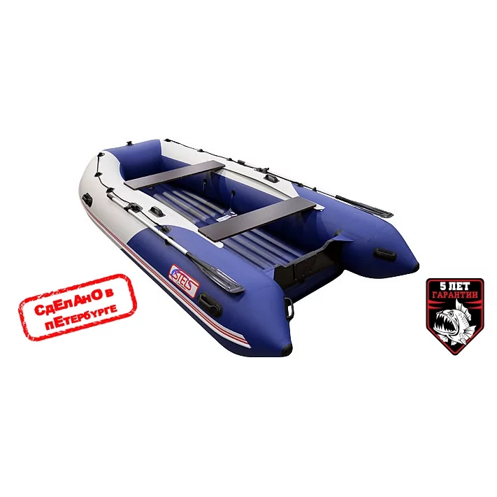 Надувная лодка СТЕЛС 375 АЭРО со стационарным вклеенным умеренно-килевым дном низкого давления (НДНД) рассчитана на использование с мотором до 20 л.с. с максимальной загрузкой до 700 кг. Предназначена для рыбалки, охоты и активного отдыха на воде небольшой компанией. Выпускается в комбинированном сине-белом цвете.
