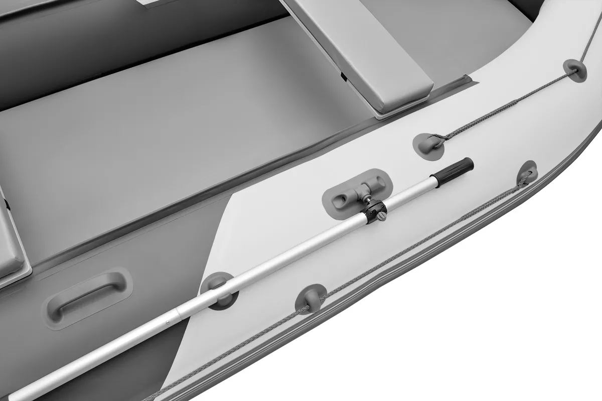 Лодка оснащена леерными поясами, натянутыми вдоль борта лодки для безопасности пассажиров. Данная модель комплектуется разборными веслами с пластиковой фурнитурой и поворотными уключинами.