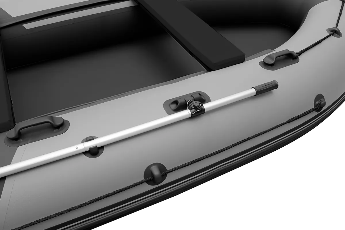 Лодка оснащена леерными поясами, натянутыми вдоль борта лодки для безопасности пассажиров. Данная модель комплектуется разборными веслами с пластиковой фурнитурой и поворотными уключинами.