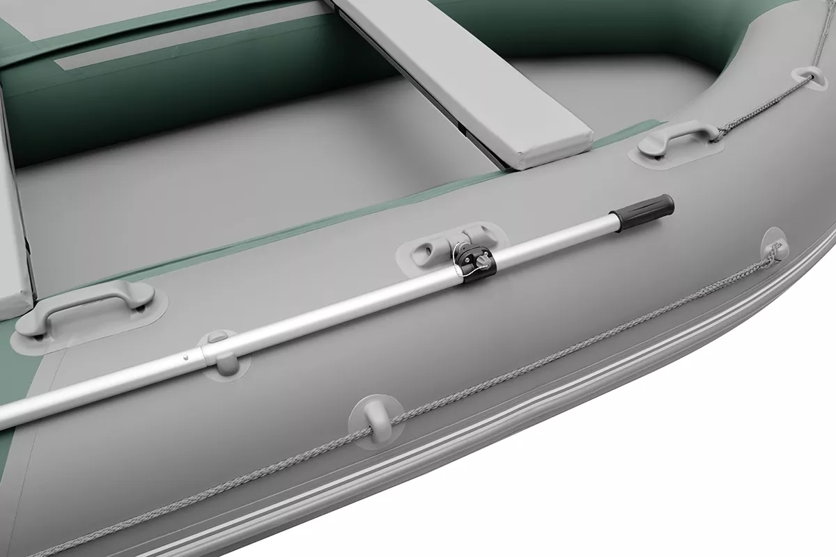 Лодка оснащена леерными поясами, натянутыми вдоль борта лодки для безопасности пассажиров. Данная модель комплектуется разборными веслами с пластиковой фурнитурой и поворотными уключинами.