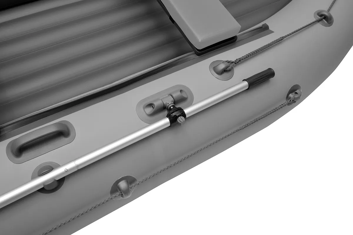 Лодка оснащена леерными поясами, каждый из которых растянут по внешней стороне борта лодки между двух шайб. Данная модель комплектуется разборными веслами с пластиковой фурнитурой и поворотными уключинами.