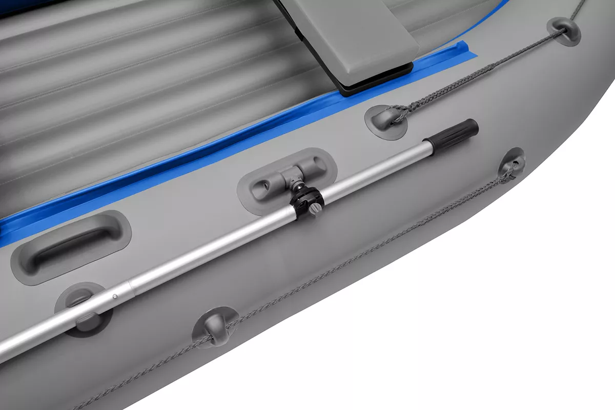 Лодка оснащена леерными поясами, каждый из которых растянут по внешней стороне борта лодки между двух шайб. Данная модель комплектуется разборными веслами с пластиковой фурнитурой и поворотными уключинами.