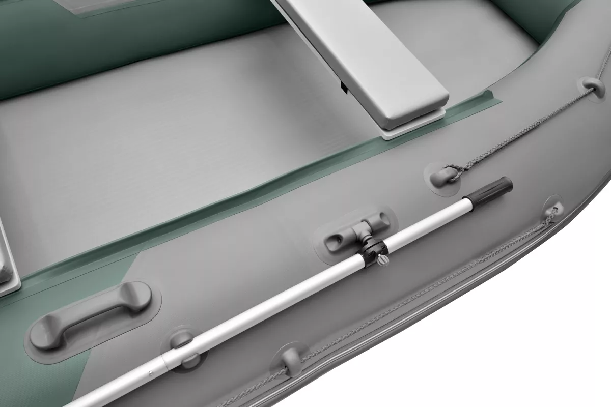 Лодка оснащена леерными поясами, натянутыми вдоль борта лодки для безопасности пассажиров. Данная модель комплектуется разборными веслами с пластиковой фурнитурой и поворотными уключинами.