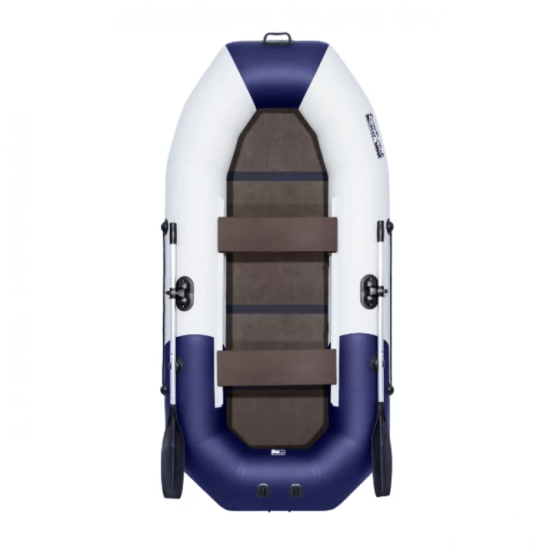 Пол лодки выполнен из влагостойкой фанеры в виде слани-книжки, что увеличивает жесткость и позволяет ставить тяжелый груз на корму или нос. Наличие навесного транца расширяет функционал лодки, позволяя использовать мотор.