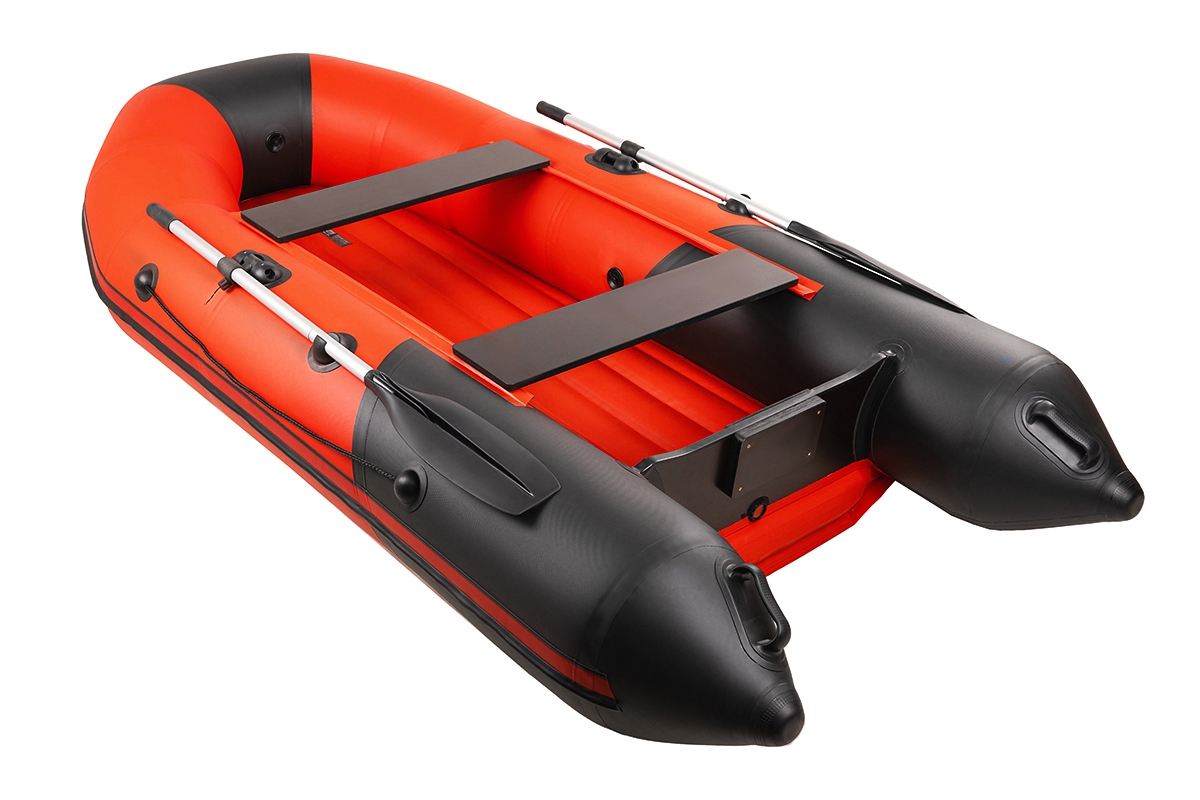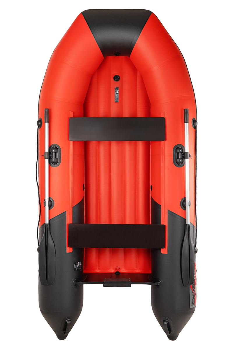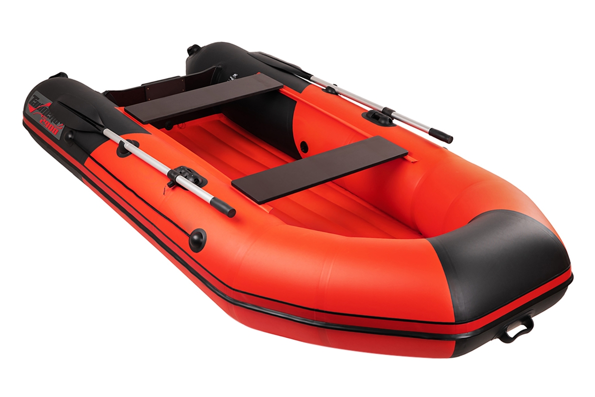 Надувная лодка ПВХ Таймень N 2900 НДНД "Комби" красный-черный с надувным дном - это моторно-гребная лодка со стационарным транцем, надувным дном низкого давления и передвижными банками.