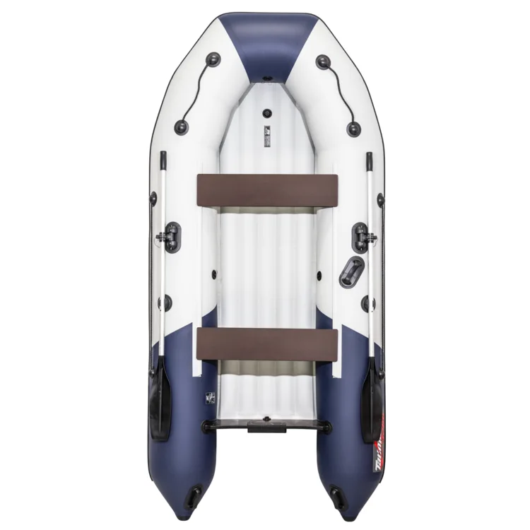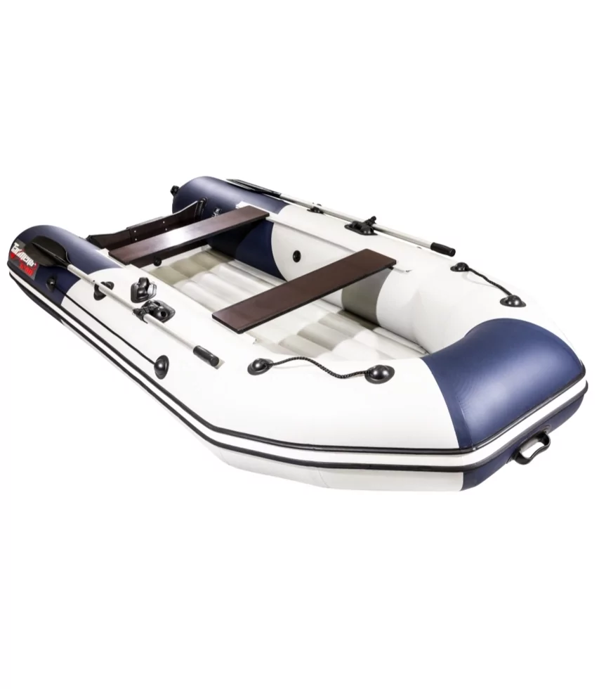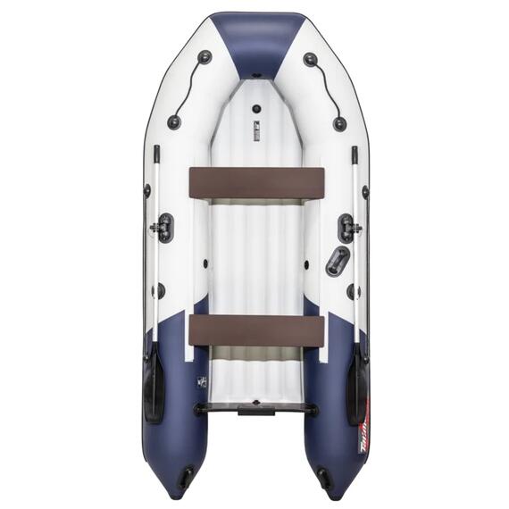 Надувная лодка ПВХ Таймень N 2900 НДНД "Комби" светло-серый/графит с надувным дном - это моторно-гребная лодка со стационарным транцем, надувным дном низкого давления и передвижными банками.