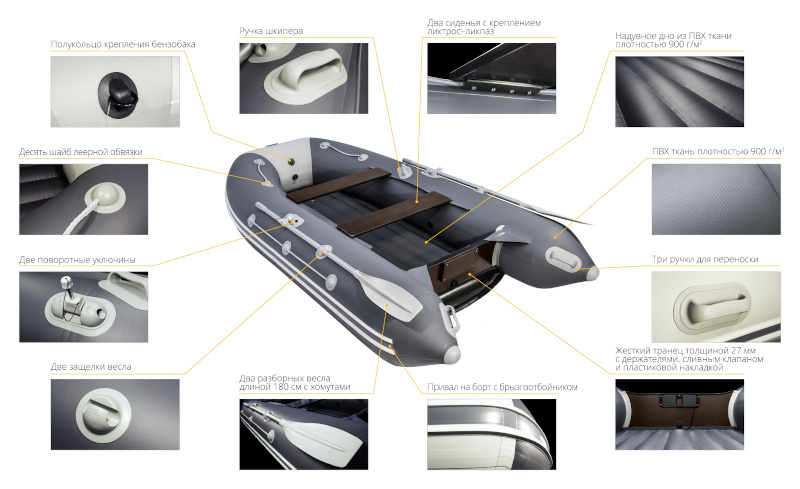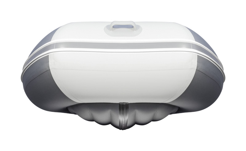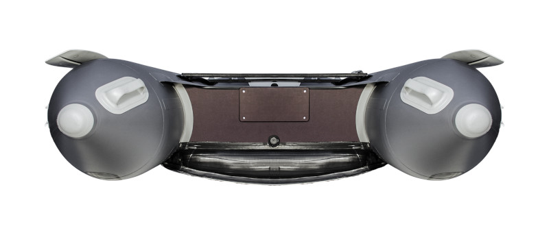 Моторно-гребная лодка с надувным дном низкого давления и стационарным транцем. Конструкция сочетает легкость транспортировки с высокой грузоподъемностью и устойчивостью на воде.