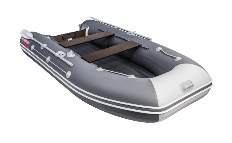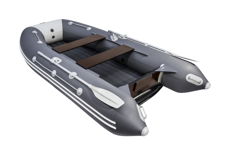 Надувная лодка ПВХ Таймень V 3400 НДНД графит/светло-серый с надувным дном - это моторно-гребная лодка со стационарным транцем, надувным дном низкого давления и передвижными банками.