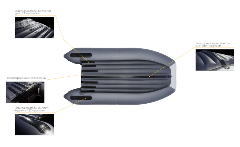Для максимальной защиты лодки от механических повреждений, баллоны дополнительно проклеены привальным брусом с брызгоотбойником (броня) и по всей длине киля (по центральному бревну низа дна) дополнительно наклеен донный брус. Также имеет защиту касательных частей дна и баллонов ПВХ профилем.