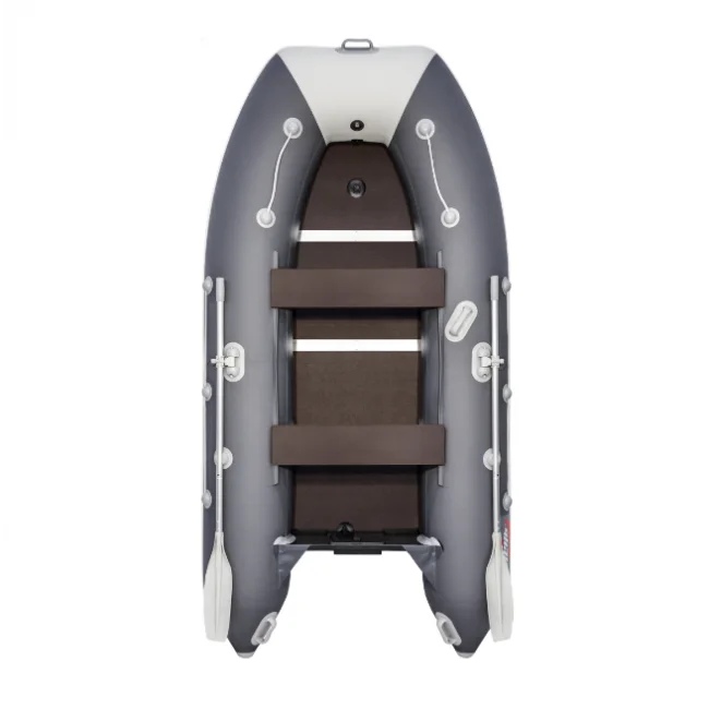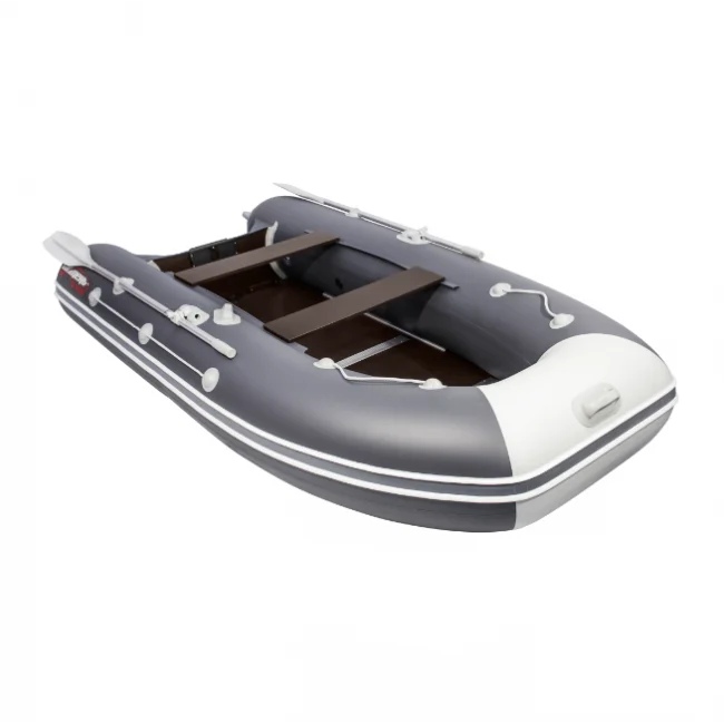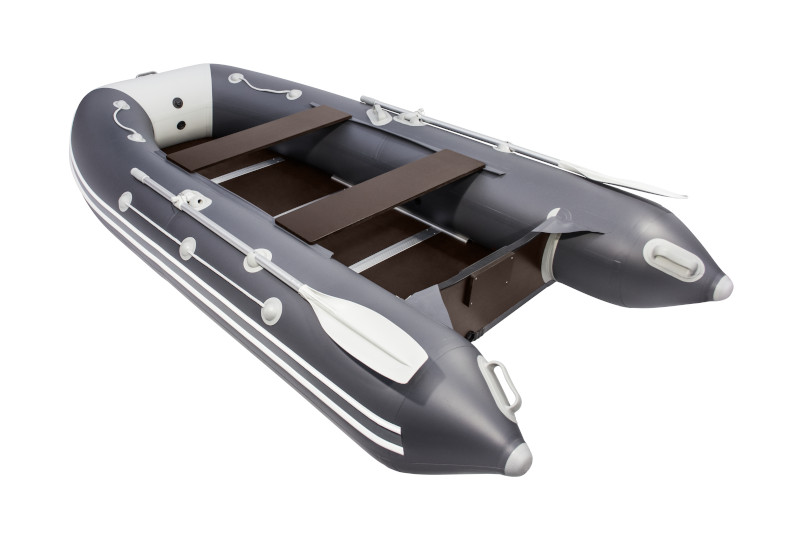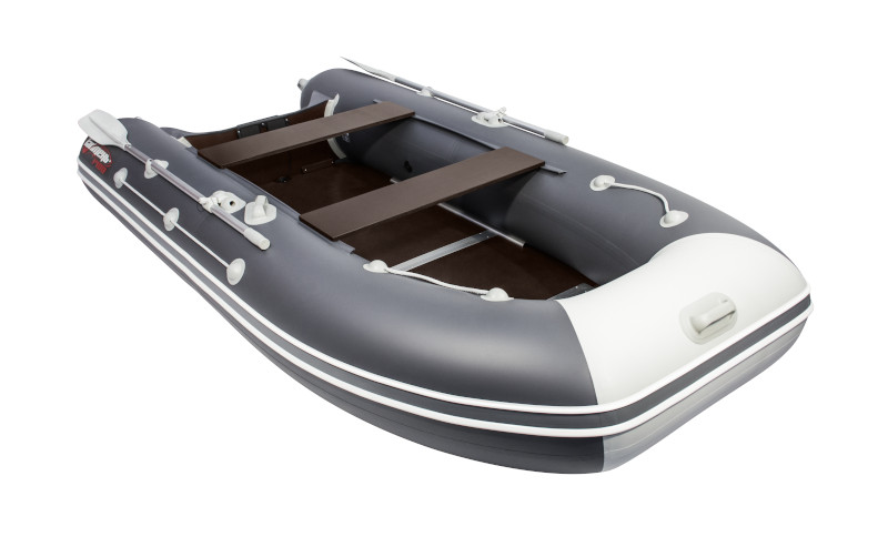 Надувная лодка ПВХ Таймень V 3400 СК графит/светло-серый с жестким фанерным пайолом - это моторно-гребная лодка со стационарным транцем, фанерным пайолом + стрингера и передвижными банками.