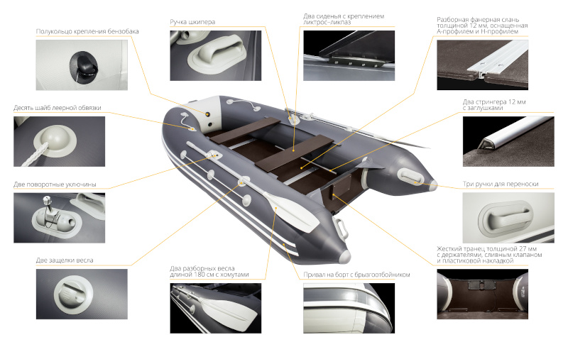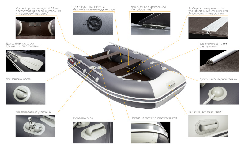 В комплект поставки входит жесткий фанерный пайол, усиленный алюминиевыми стрингерами, что позволяет уверенно стоять в лодке в полный рост при забросах спиннинга.
