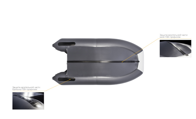 Для максимальной защиты лодки от механических повреждений, баллоны дополнительно проклеены привальным брусом с брызгоотбойником (броня) и по всей длине киля (по центральному бревну низа дна) дополнительно наклеен донный брус. Также имеет защиту касательных частей баллонов ПВХ профилем.