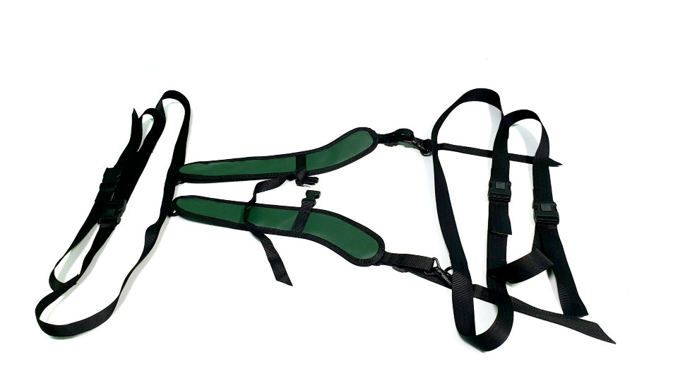 Подходящие лямки продаются отдельно. Сперва нужно застегнуть ремни, опоясывающие баллоны, а затем застегнуть ремни, прижимающие сиденье и ласты.