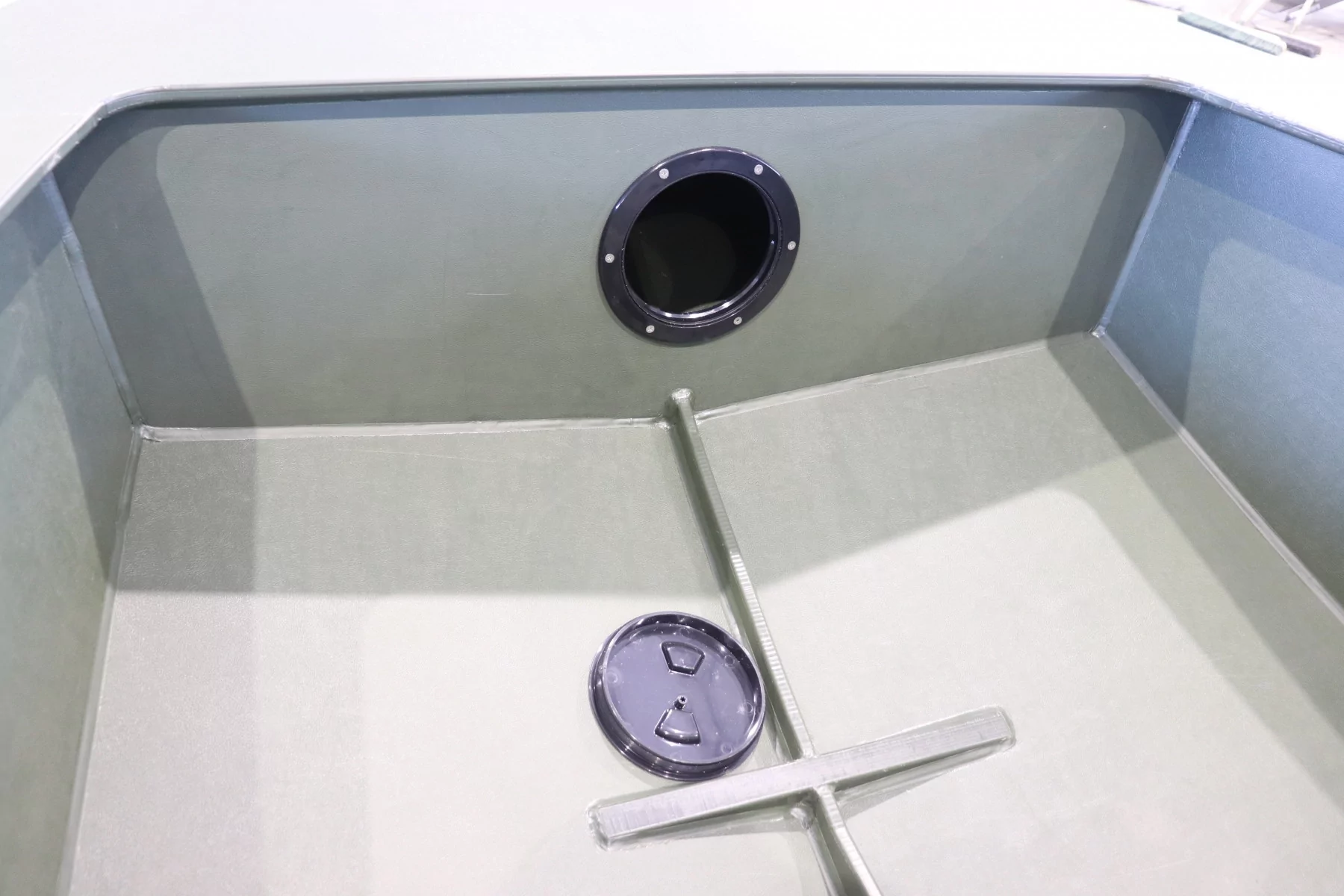 Материал ПНД: выполнен из первичного сырья, с УФ-стабилизатором (добавка, позволяющая использовать лодку на солнце, без изменения структуры ПНД) Используем полиэтилен низкого давления марки PE 80, PE 100. С одной стороны имеется перфорация "под кожу"