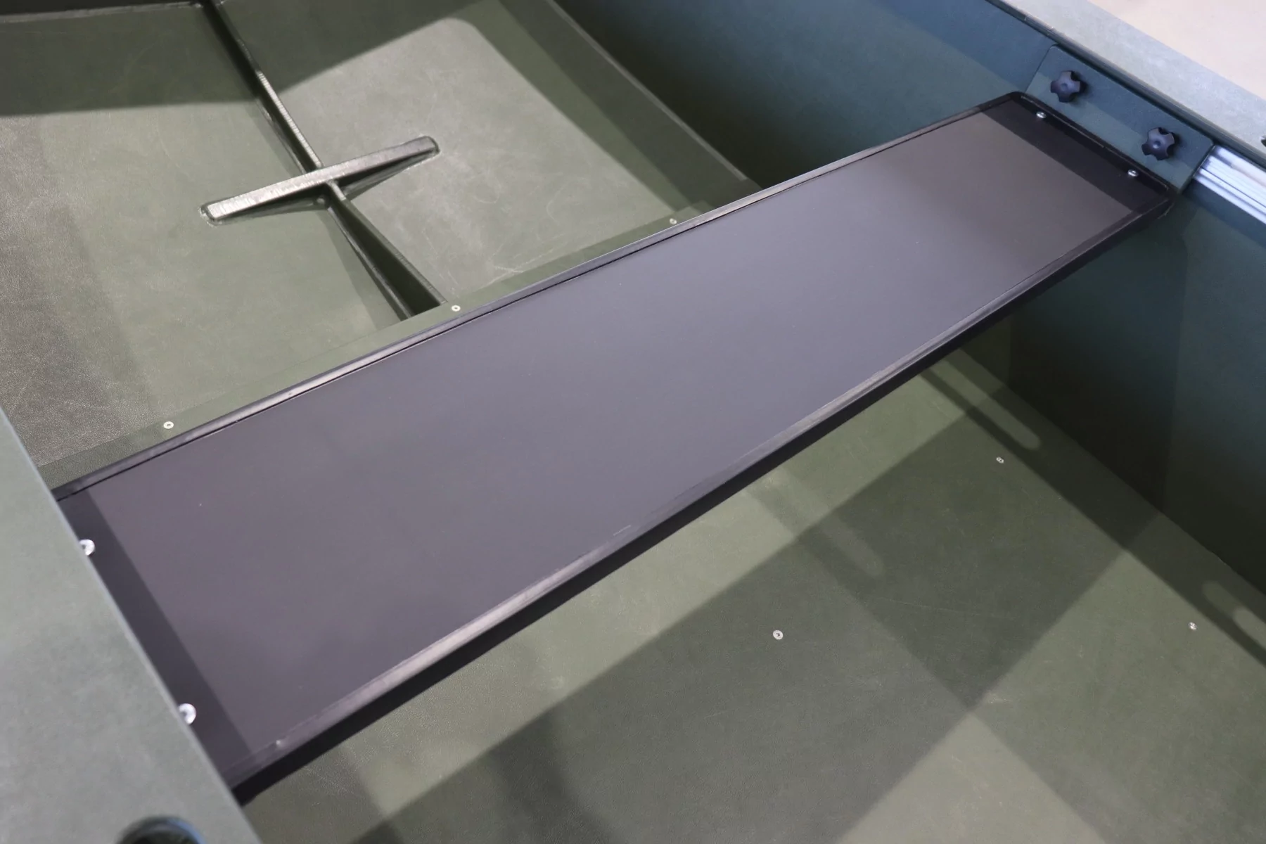 Под заказ может быть укомплектована транспортировочным тентом, спининнгодержателями, сиденьем капитана, рундуком. На лавки доступны к заказу мягкие накладки.