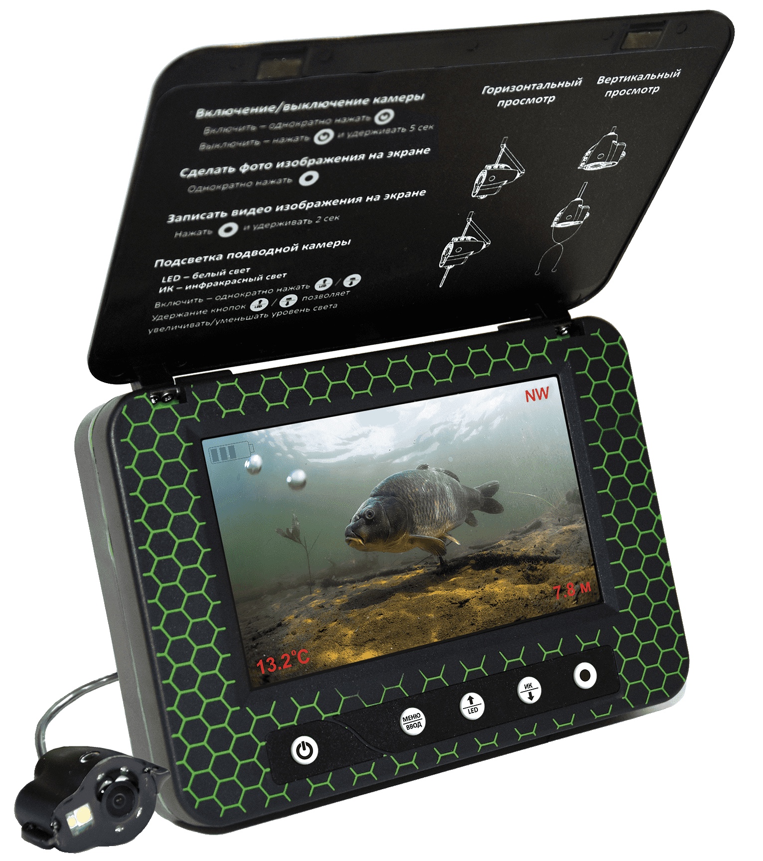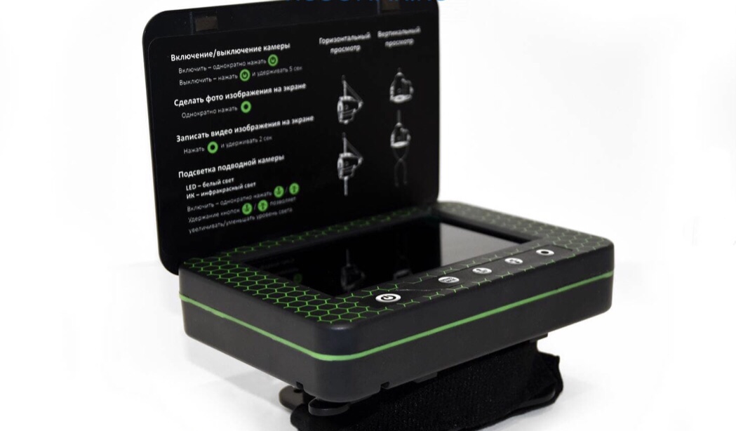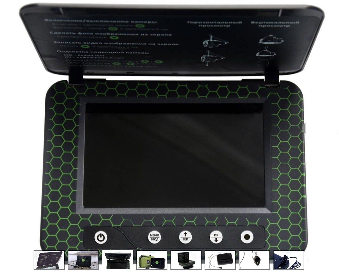 Переносной 5-дюймовый цветной TFT монитор с высоким разрешением 960х480 показывает четкую и яркую картинку даже на глубине 10-15 м при среднем уровне прозрачности воды. А наличие солнцезащитного козырька обеспечит отсутствие бликов на экране.