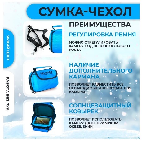Яркий синий цвет сумки сделает Calypso заметнее на снегу или в траве и поможет не потерять ее. Calypso UVS-04 подойдет тем, кто хочет сделать свою рыбалку результативнее и не терять время над пустой лункой. В этой модели нет функции фото- и видеозаписи, но зато есть все преимущества систем видеонаблюдения Calypso.
