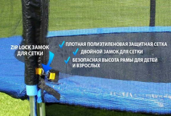 ✔Высокая защитная сетка – также важное условие для безопасности батута. Сеть Atlas Sport выполнена из высококачественного нейлона, в меру эластична и обладает амортизирующими свойствами. Ширина каждой ячейки подобрана таким образом, чтобы даже самые маленькие пальчики не могли застрять в ней. Вход/выход через сетку выполнен на молнии с 4-мя фиксирующими защелками на внешней стороне сетки для защиты от случайного открытия.