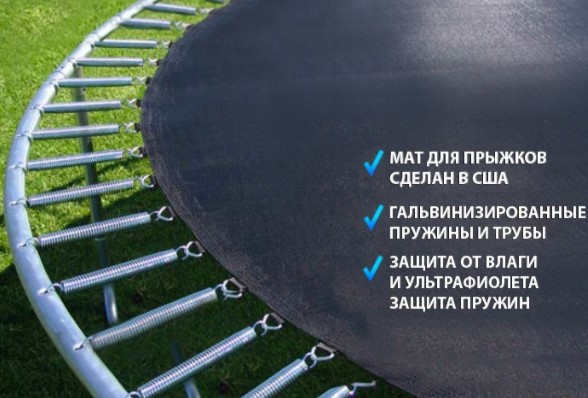 Прыжковое полотно произведено в США и изготовлено из прочного и упругого полипропилена. Выдерживает высокие и длительные нагрузки, устойчиво к влаге и механическим повреждениям. Также полотно имеет защиту от ультрафиолета, благодаря чему полотно не выгорает и греется намного меньше.